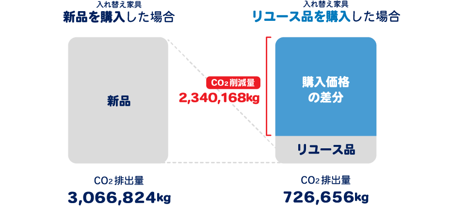 販売サービスでは、金額ベースのCO2排出原単位に当社家具の購入価額をかけ、それを新品の価格と比較することで削減量としている。*算定条件が異なる場合、数値比較できない場合がございます。