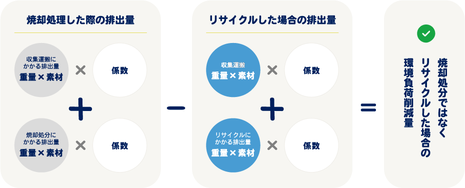 弊社が長年蓄積してきた各製品ごとの「素材比率データベース」を用い、製品の素材の比率を求めた上、排出原単位係数(*1)を乗じることで排出量を導き出します。*算定条件が異なる場合、数値比較できない場合がございます。