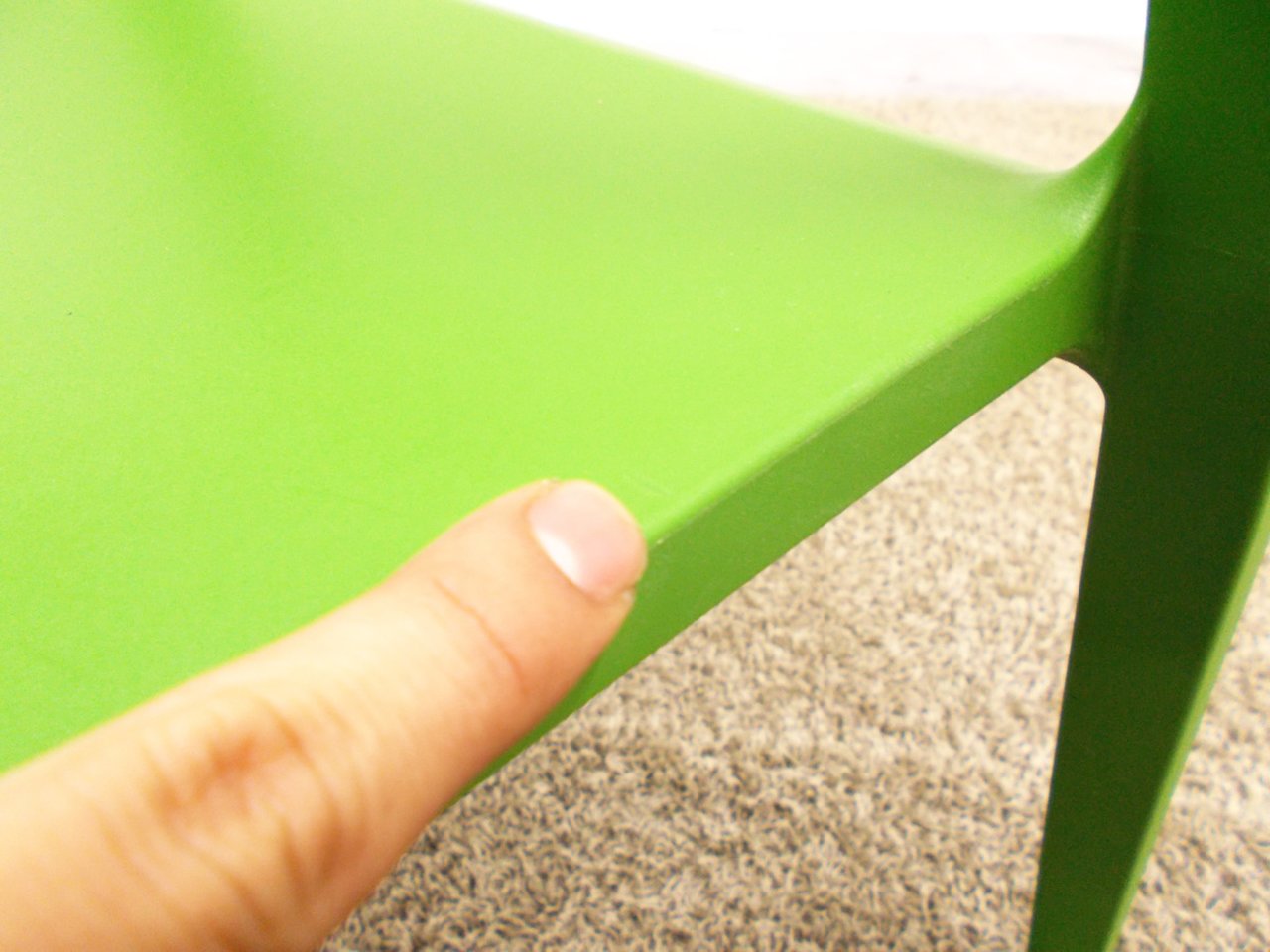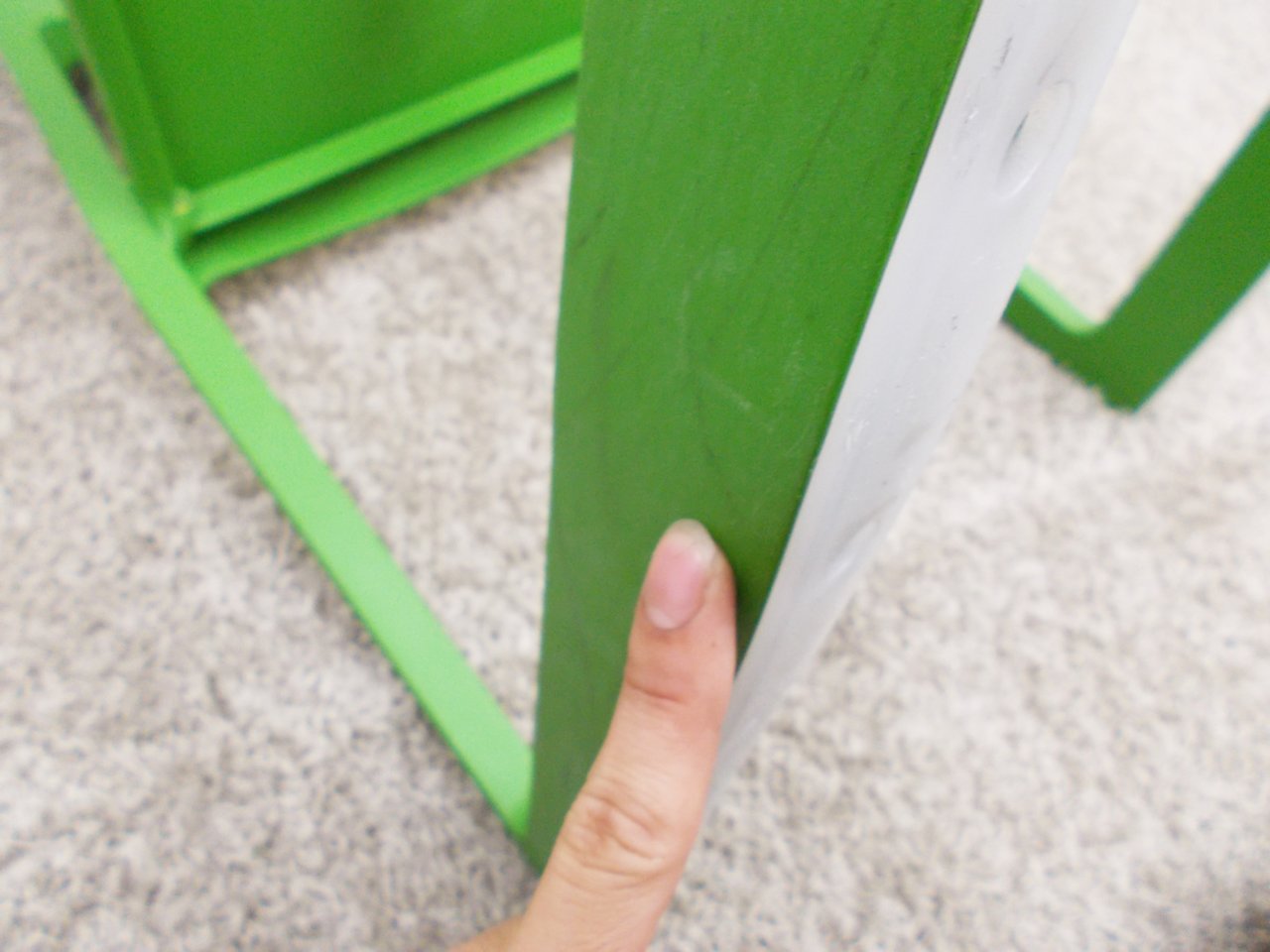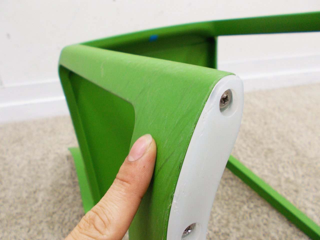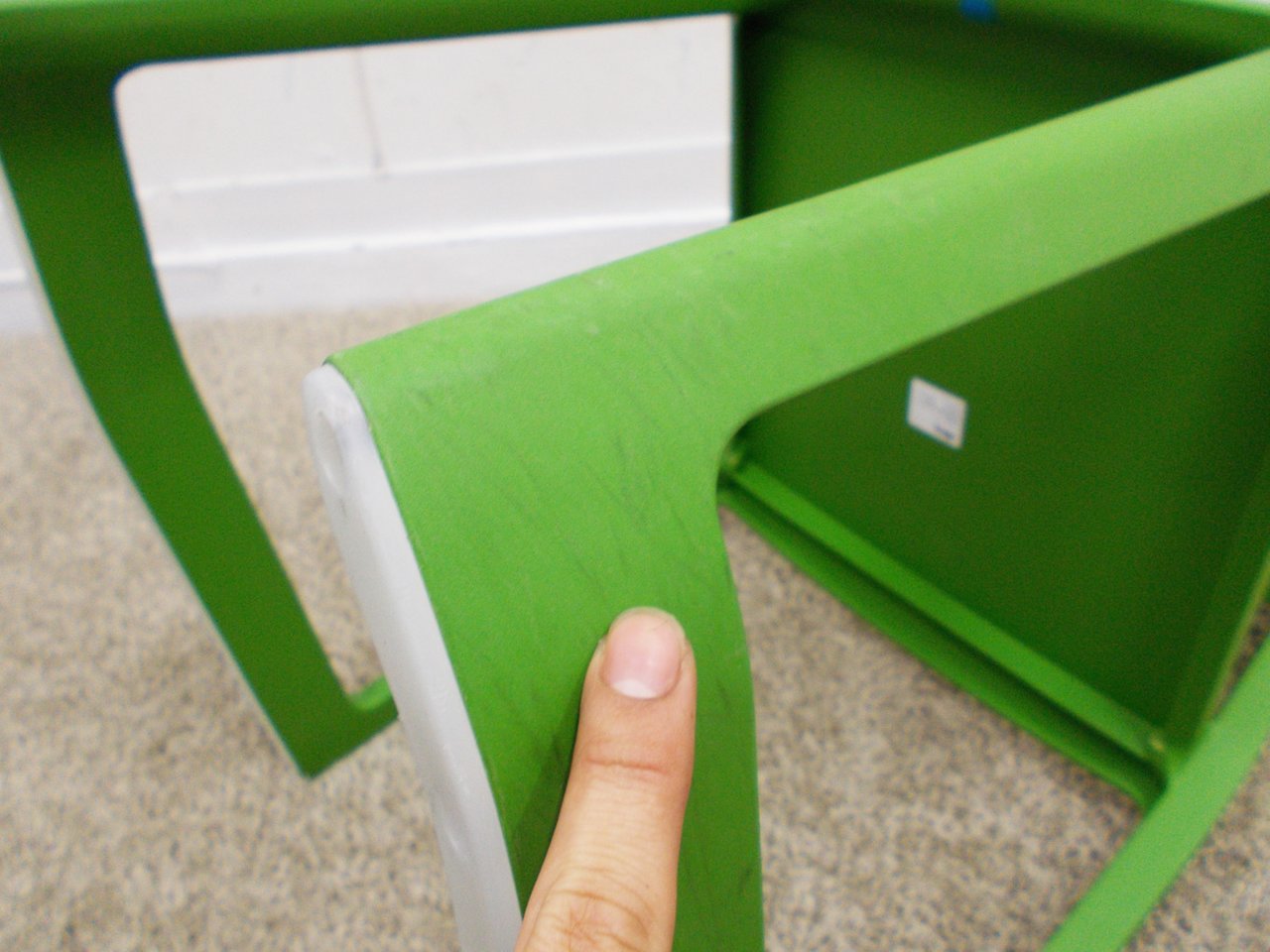 - かなり強い濃い黄ばみ・変色が商品全体にある。(例、座面・背もたれ、脚部等にある。)