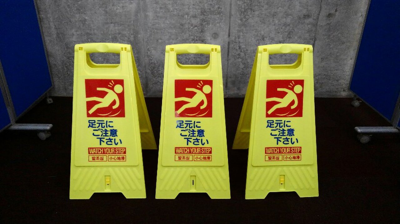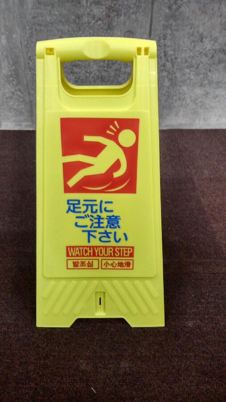 3枚1セット価格!! フロアスタンド 【足元にご注意下さい】両面表示のものが初入荷しました!! 日本語・中国語・韓国語・英語の4ヶ国語表示で便利です。 ※マテハン本舗の中古商品は、千葉県柏市に在庫がございます。- マテハン本舗