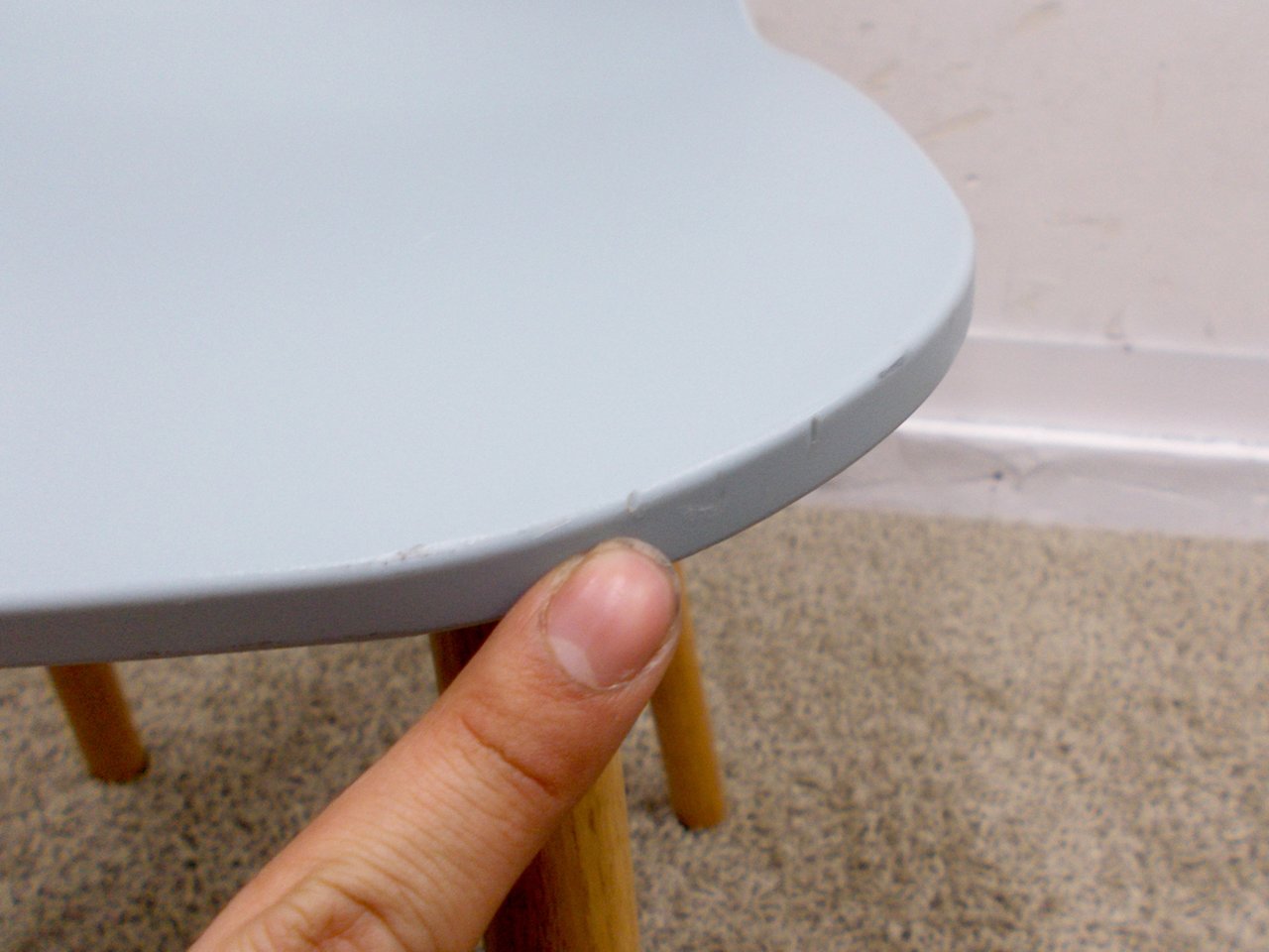 - かなり強い濃い黄ばみ・変色が商品全体にある。(例、座面・背もたれ、脚部等にある。)