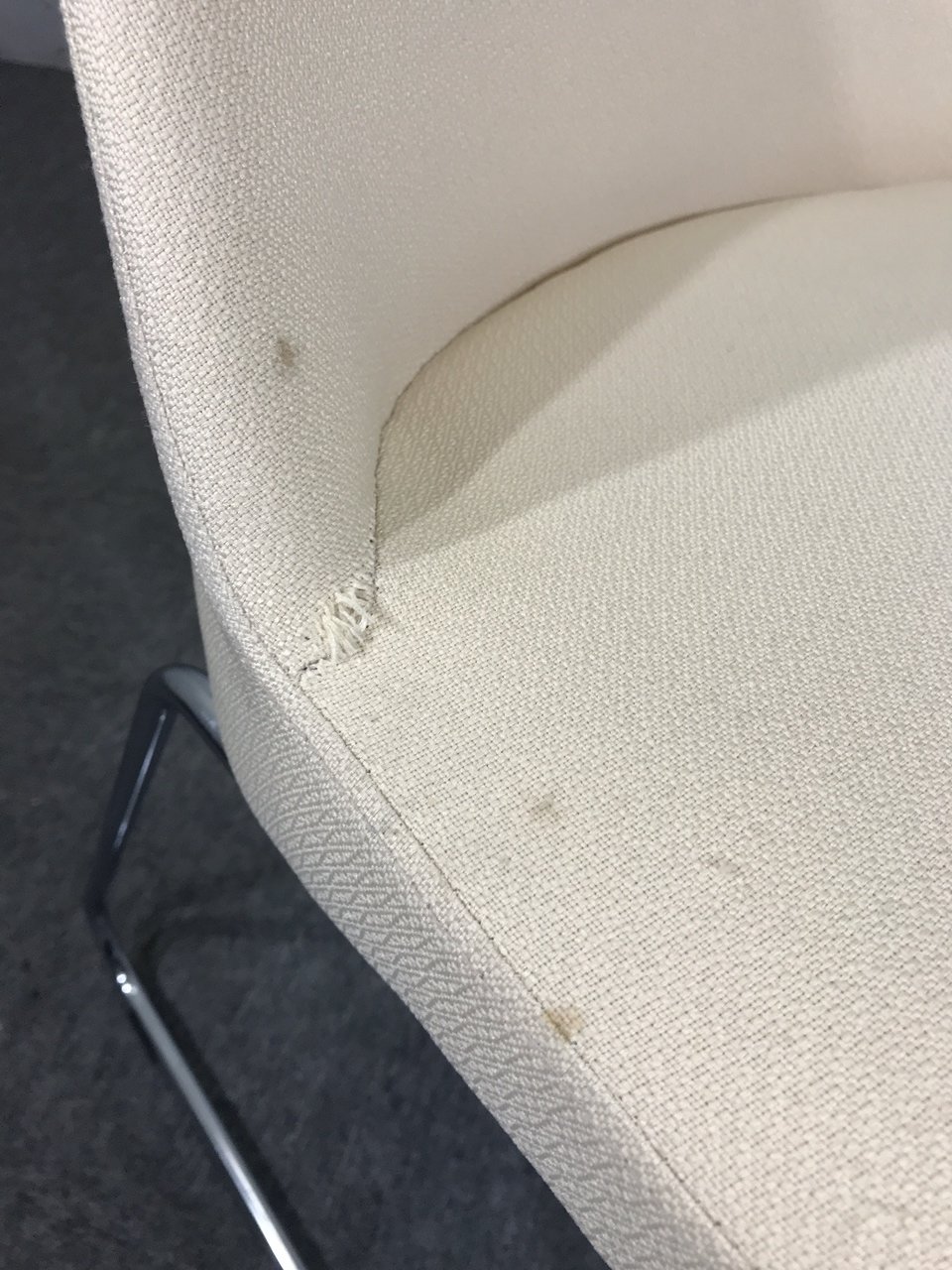 - かなり強い濃い黄ばみ・変色が商品全体にある。(例、座面・背もたれ、脚部等にある。)