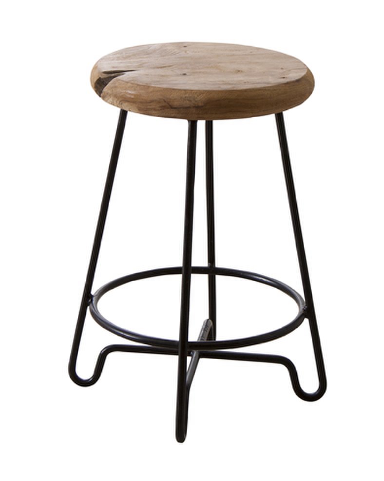 黒いフレームにデザイン性を持たせ、味わい深いチークの無垢材と組み合わせたスツール。