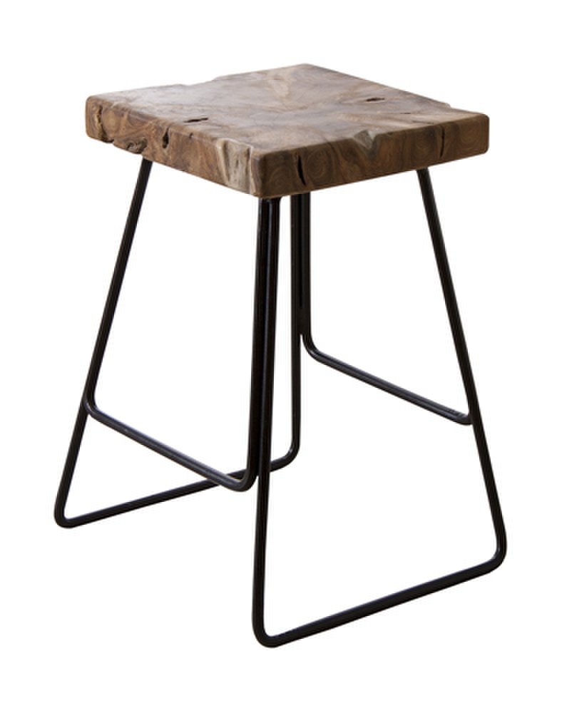 黒いフレームにデザイン性を持たせ、味わい深いチークの無垢材と組み合わせたスツール。