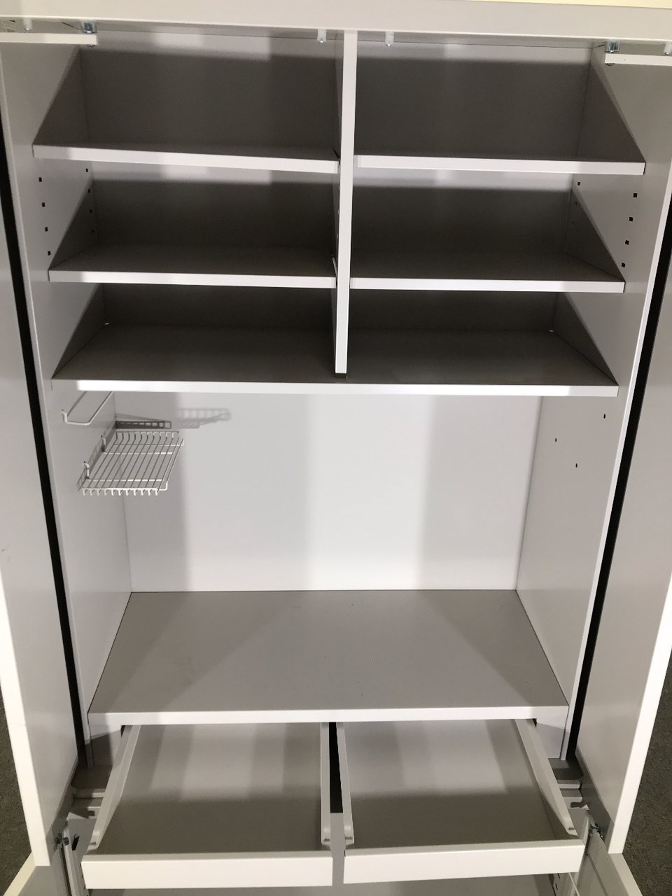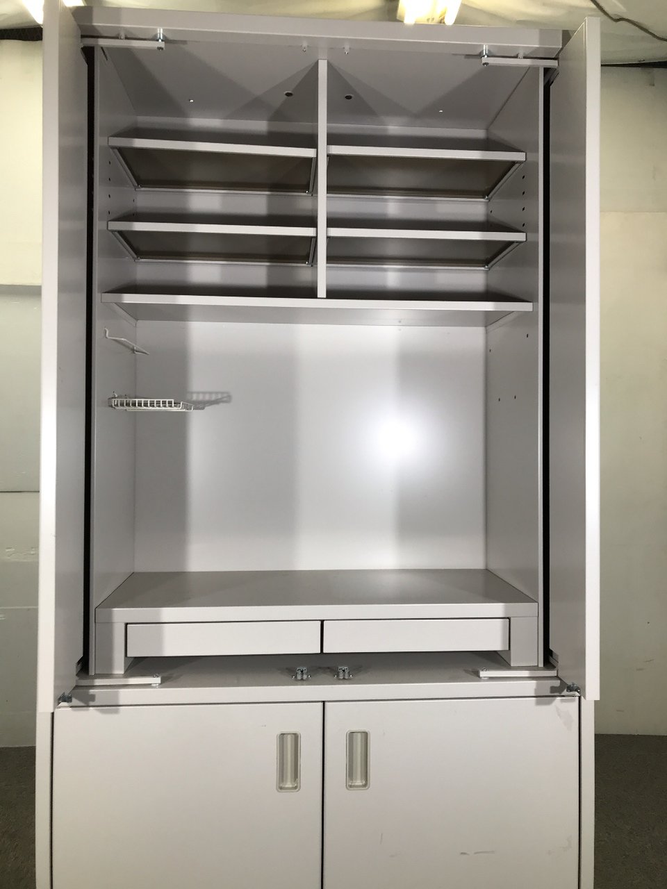 ポットや食器などの収納スペースに便利です、下部は2段のみの収納になります。