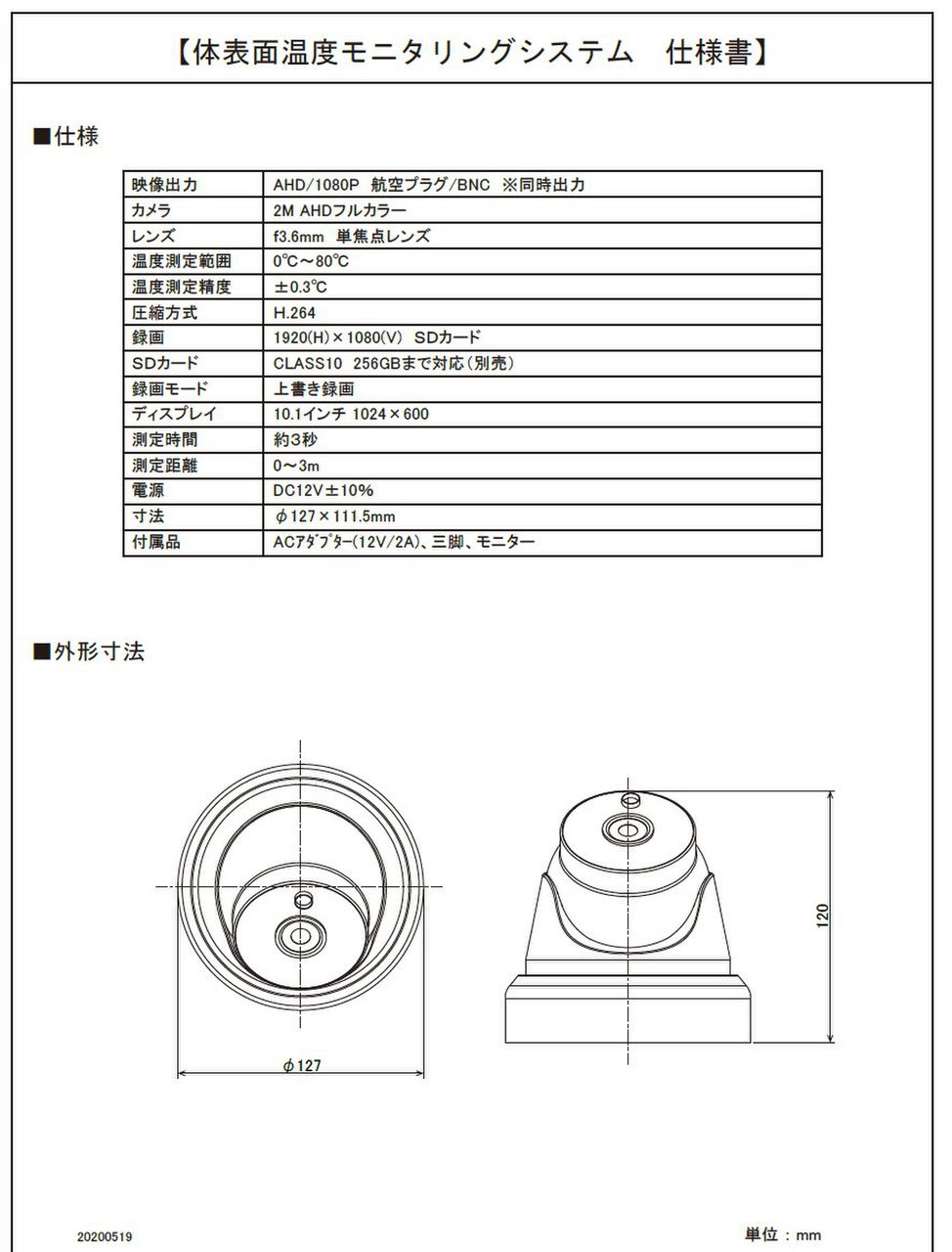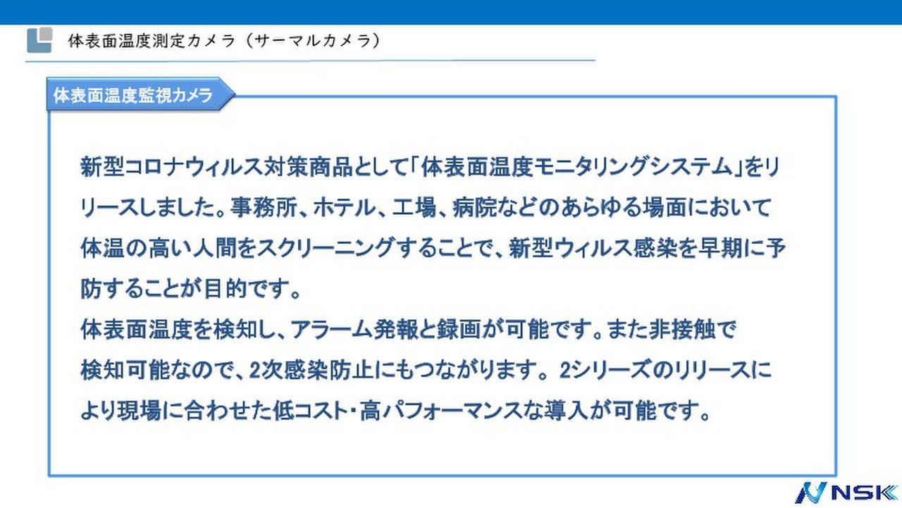 体表面温度測定カメラ(サーマルカメラ) 体表面温度監視カメラ 新型コロナウィルス対策商品として「体表面温度モニタリングシステム」をリ リースしました。事務所、ホテル、工場、病院などのあらゆる場面において 体温の高い人間をスクリーニングすることで、新型ウィルス感染を早期に予 防することが目的です。 体表面温度を検知し、アラーム発報と録画が可能です。また非接触で 検知可能なので、2次感染防止にもつながります。 2シリーズのリリースに より現場に合わせた低コスト・高パフォーマンスな導入が可能です。
