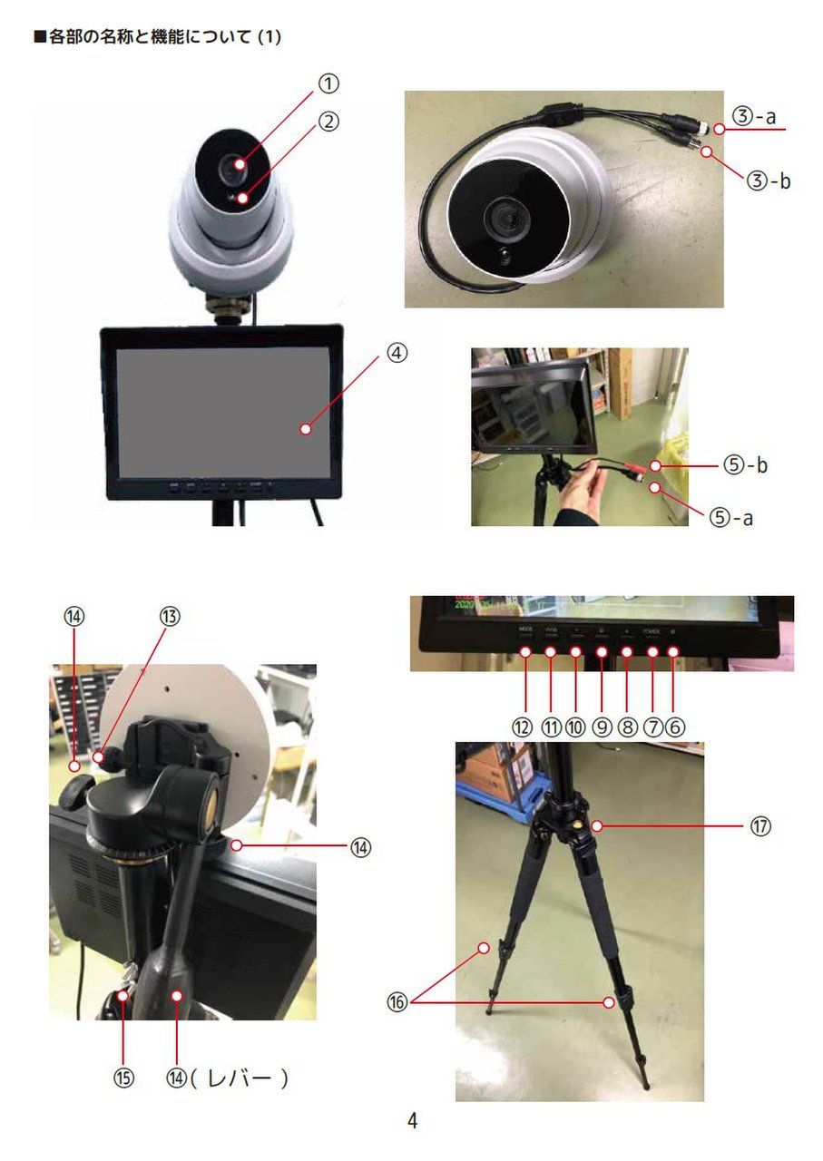 カメラ機器紹介-① NS-P7220TP 200万画 機器の構成 素ドーム カメラ ①200万画素カメラ②10.1インチモニター③三脚 ④ACアダプターの 4点フルセット SDカード (別売) 設置条件 撮影環境の温度に精度が左右されますので 屋内常温の環境でのみ利用できます。 10.1インチ モニター 三脚 設置方法 簡単組み立て、簡単設置で専門的な知識も必要ありません。 付属のACアダプターで電源供給するので100Vコンセントの みご用意ください。