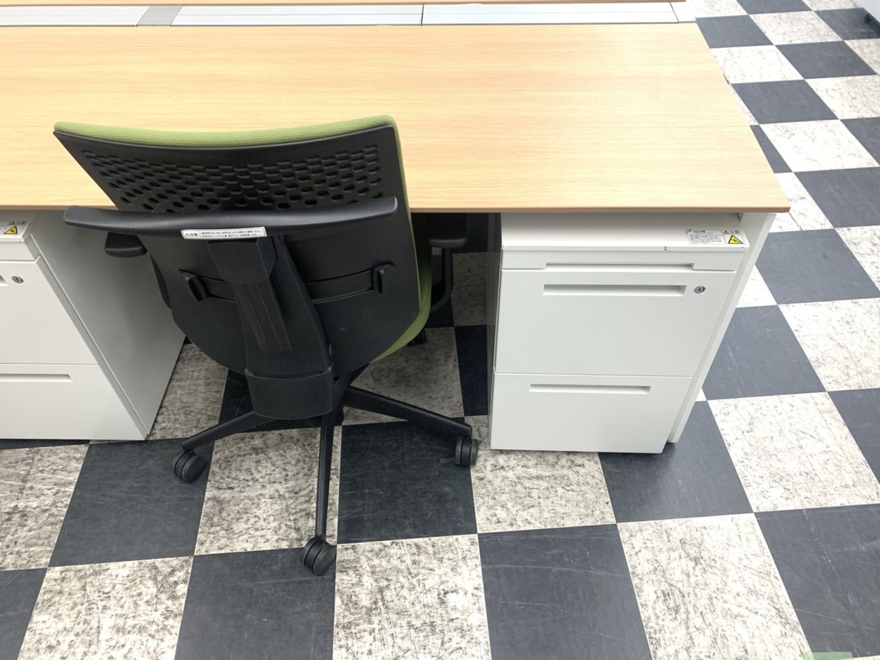 オカムラ製フリーウェイシリーズのフリーアドレスデスク(天板色MK38)と、