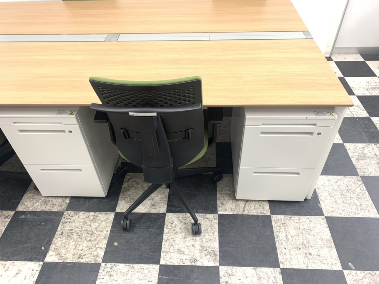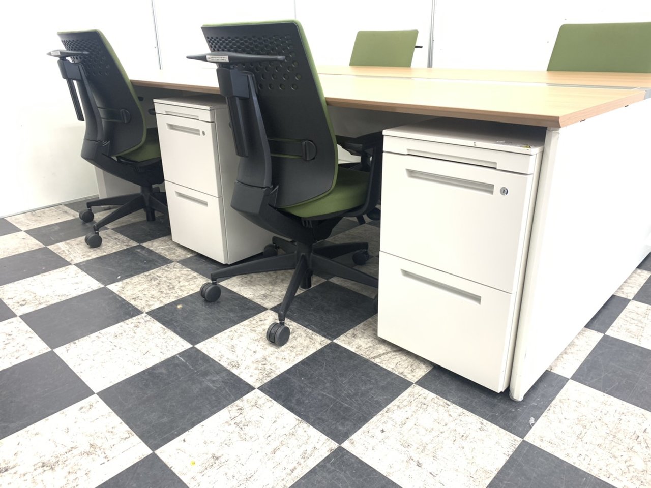 オカムラ製フリーウェイシリーズのフリーアドレスデスク(天板色MK38)と、