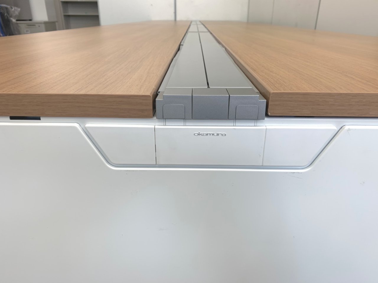 オカムラ製フリーウェイシリーズのフリーアドレスデスク(天板カラーMK38)と、
