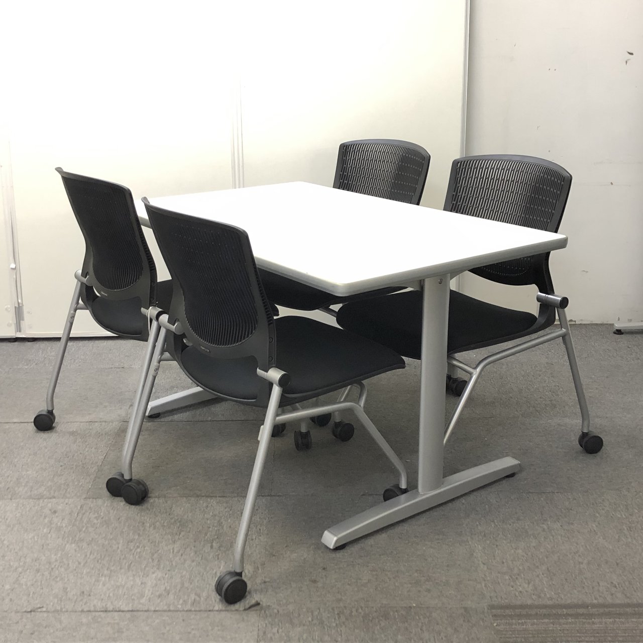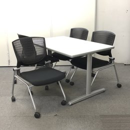 オカムラ製の人気ホワイトカラーのミーティングテーブル+ブラックカラーのチェア4脚のセットです!