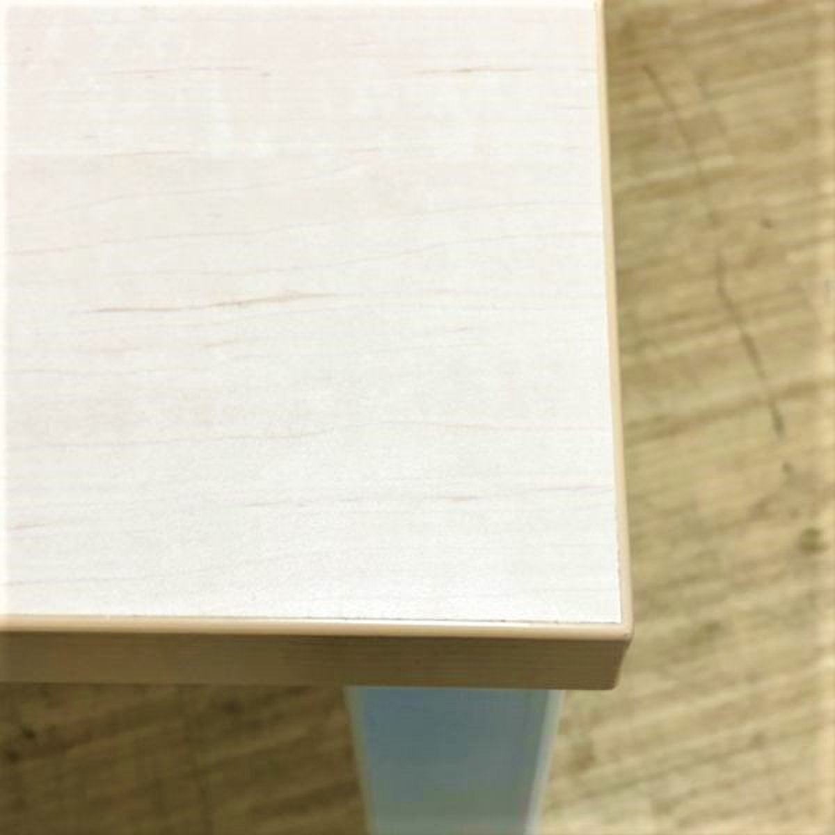 ナチュラルの木目天板にホワイト脚が4本あり、
