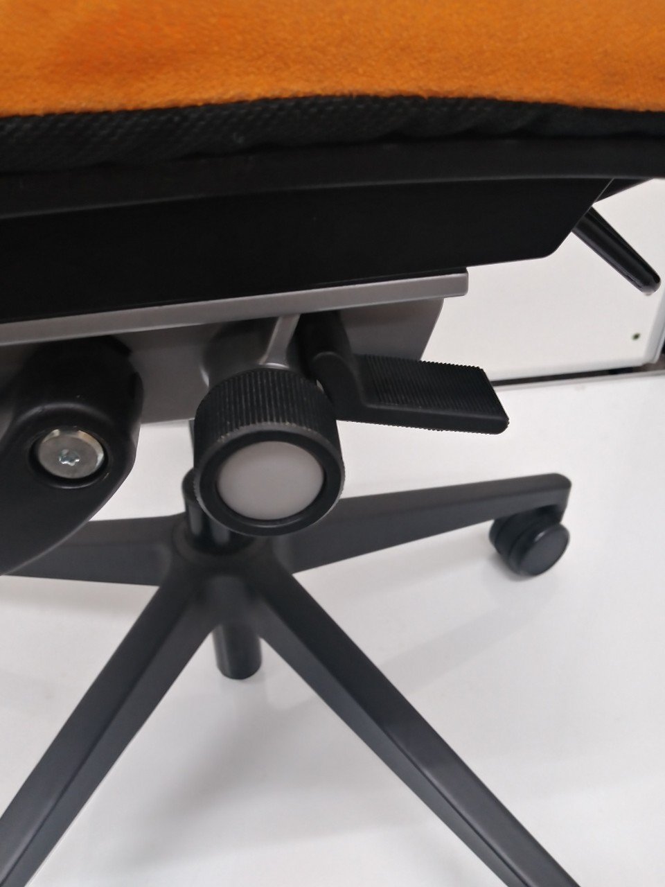 - レバーを引き上げながら座面を前後にスライドさせ、レバーを放すとロックします。背もたれに身体をつけた状態で膝の裏側と座面のエッジの間に5-8センチほどの隙間ができるのが理想的です。