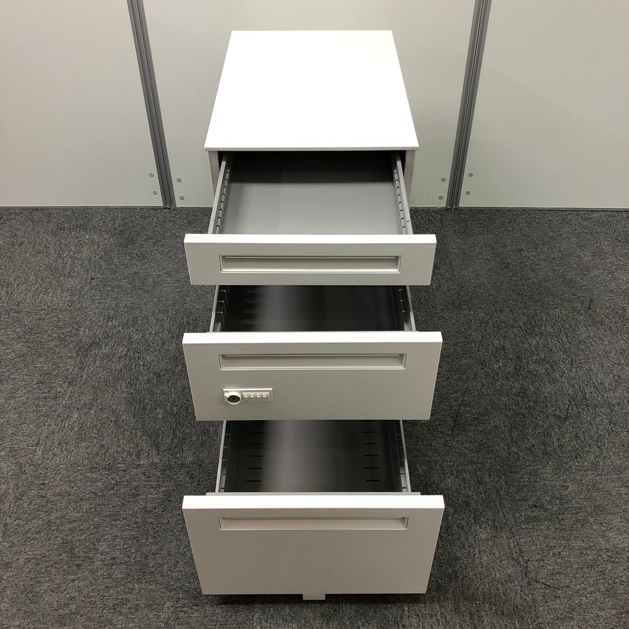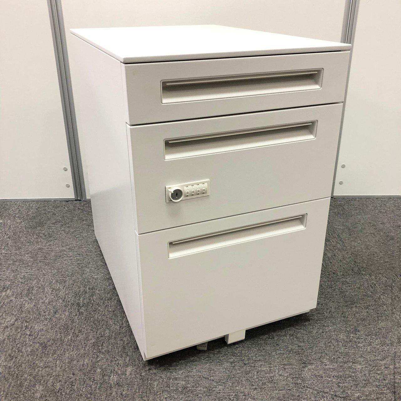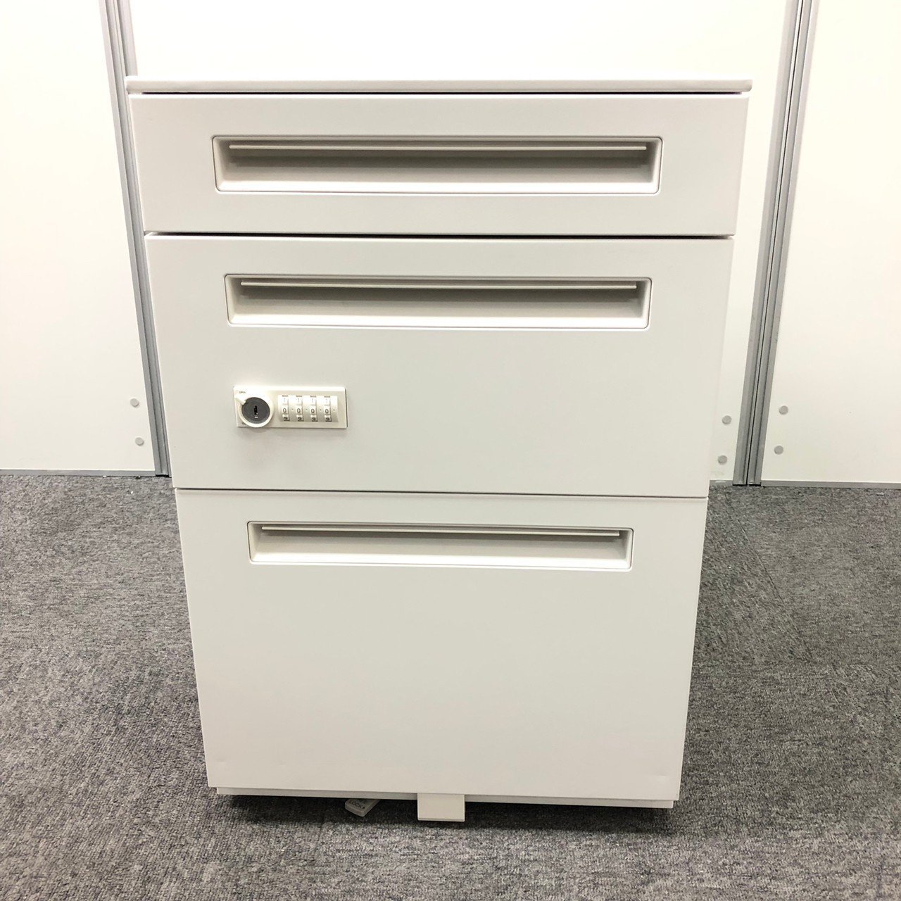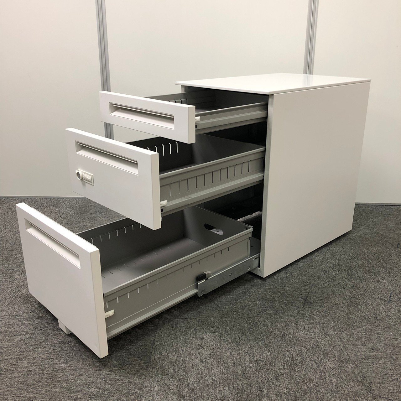 - 一部不具合ありその脇机・ワゴンの本来の効用を果たすための機能以外の一部が使用不可な状態。(例、引出が開閉しづらい、 キャスターロック機能使用不可、ラッチ不良 等がある。)