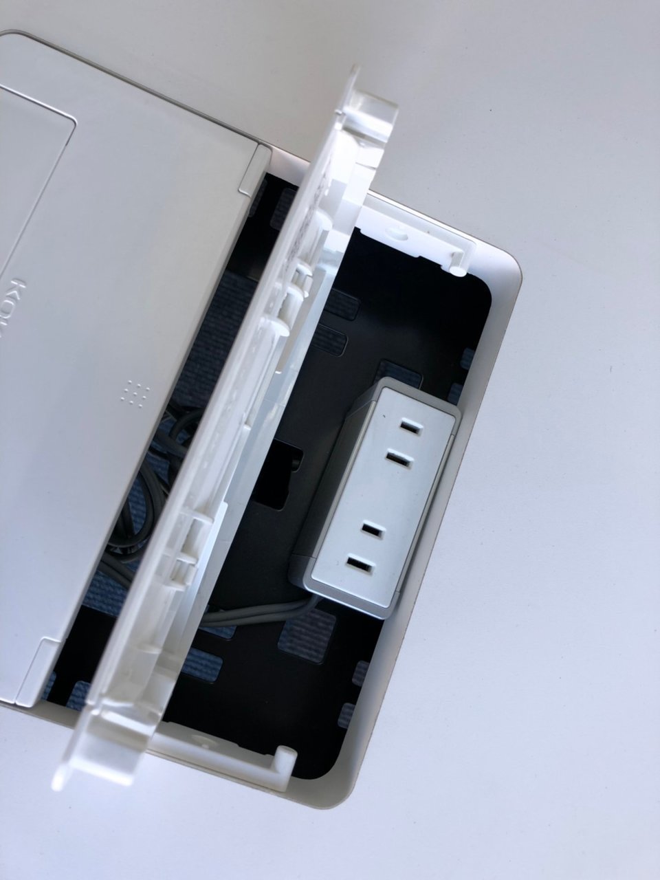 配線タップが2箇所ありテーブル上の配線を綺麗に収納できます。