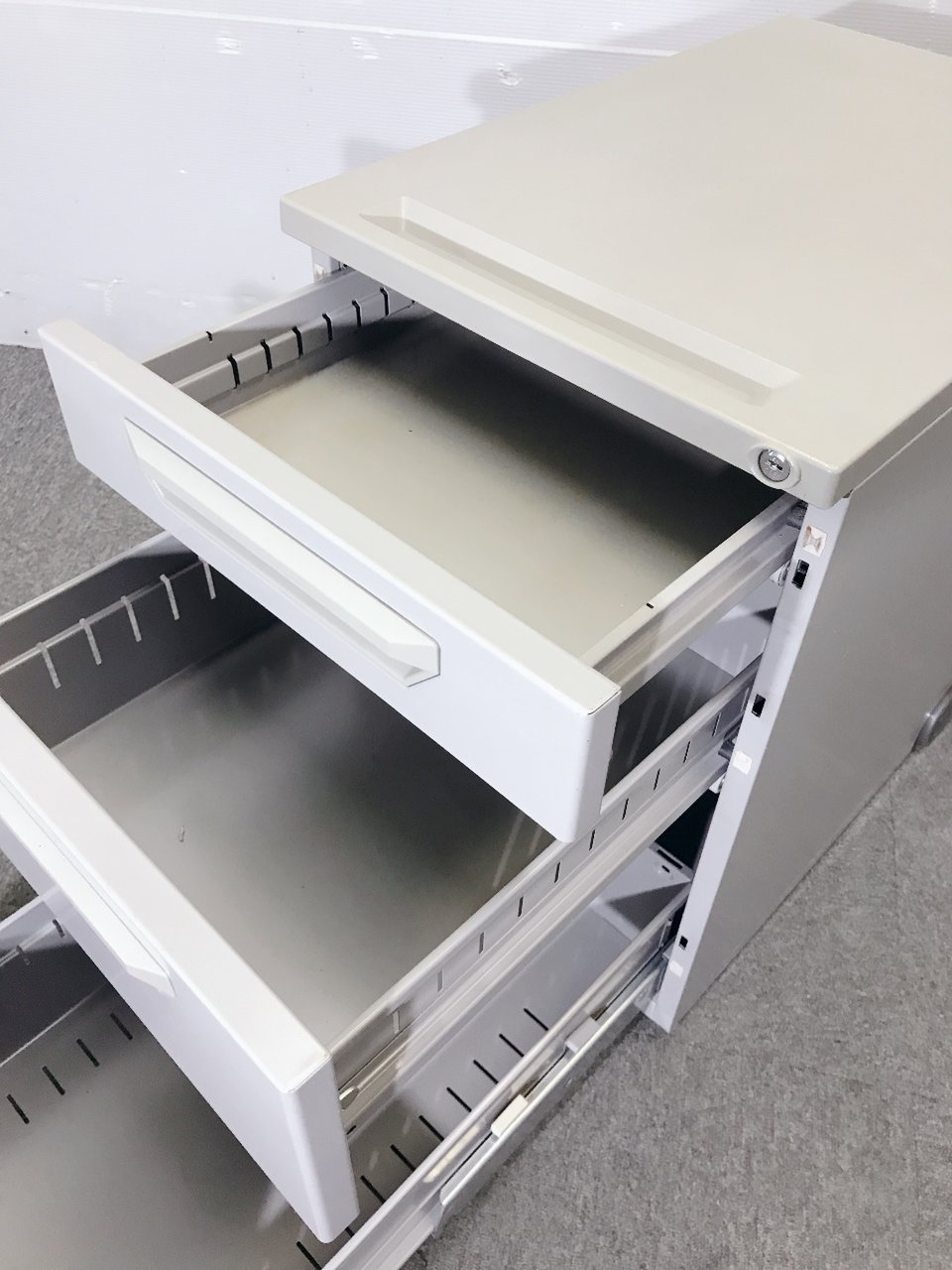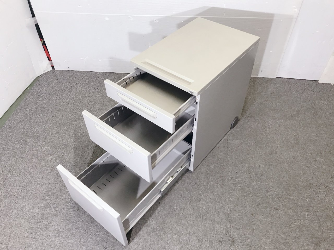 - 一部不具合ありその脇机・ワゴンの本来の効用を果たすための機能以外の一部が使用不可な状態。(例、引出が開閉しづらい、 キャスターロック機能使用不可、ラッチ不良 等がある。)