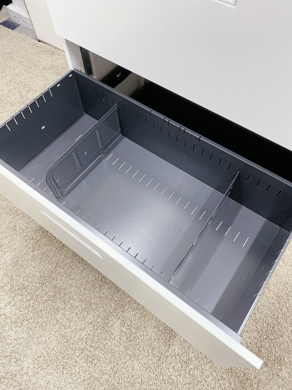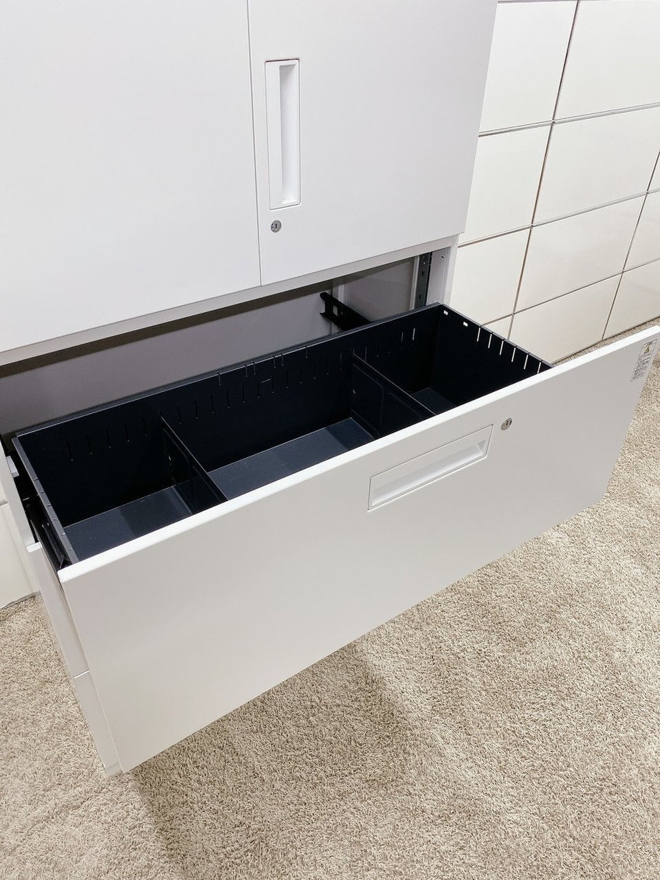 - 両開きタイプは扉が180度開き、通路の邪魔になりません。ラテラルタイプは引出しが限界まで出せ、出し入れ楽々。