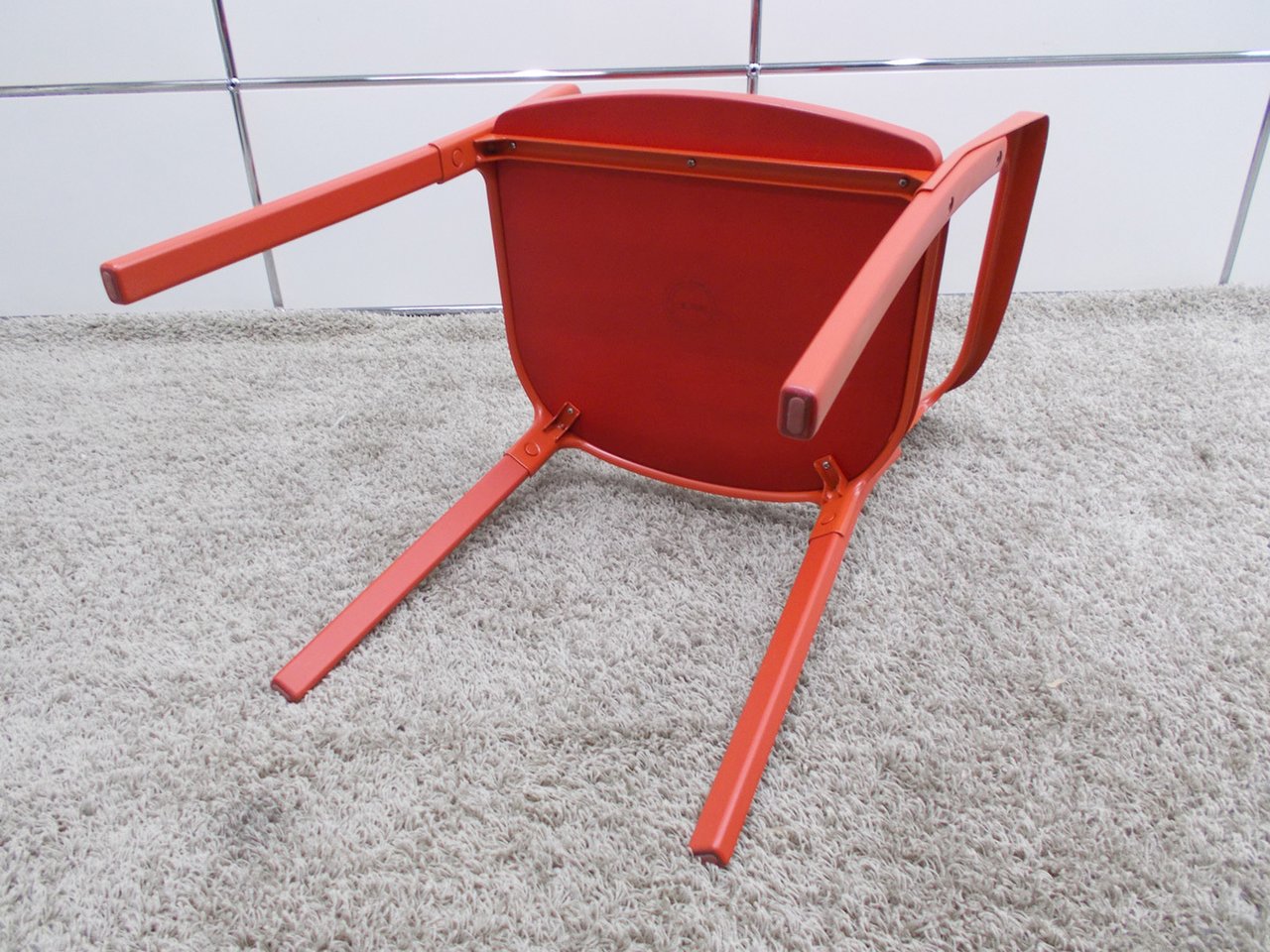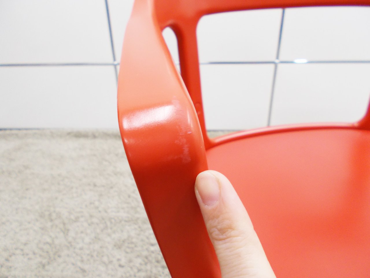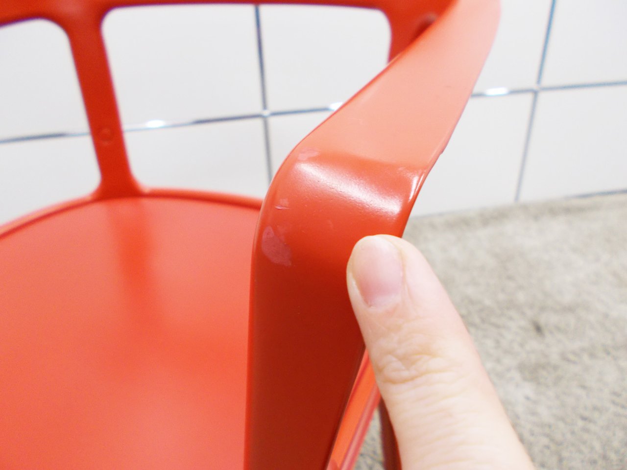- かなり強い濃い黄ばみ・変色が商品全体にある。(例、座面・背もたれ、脚部等にある。)