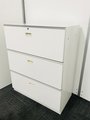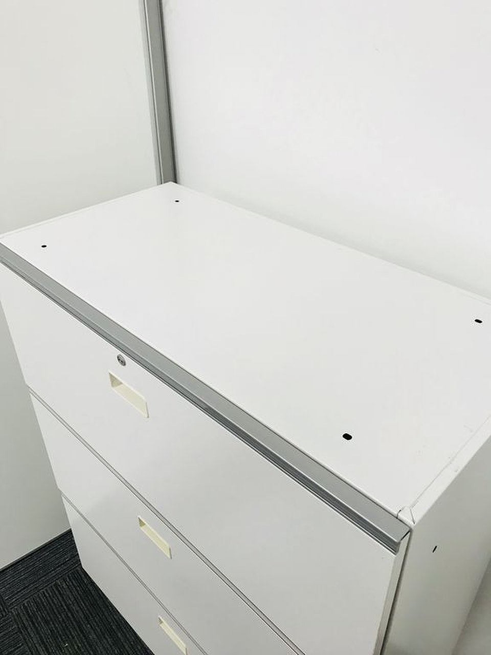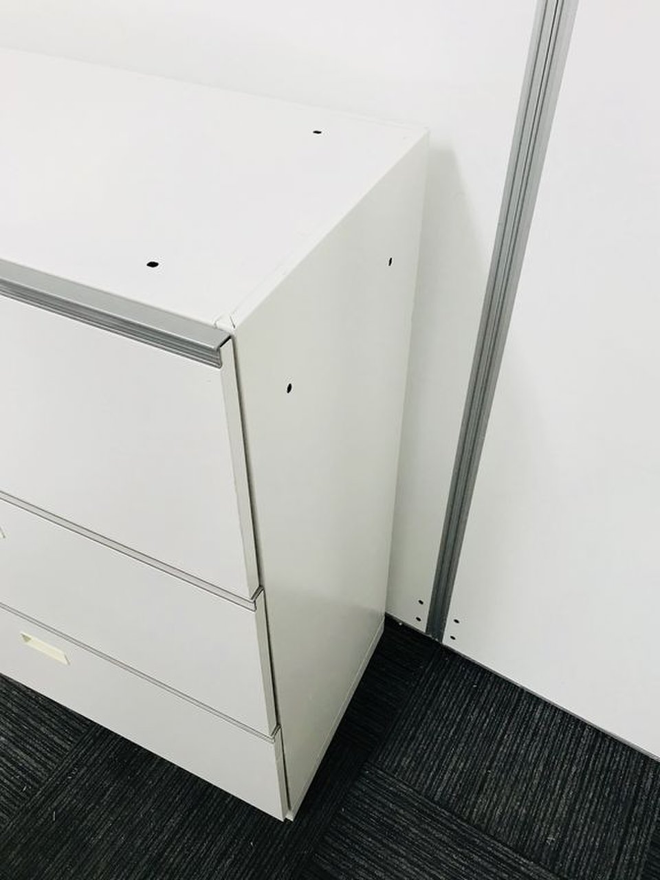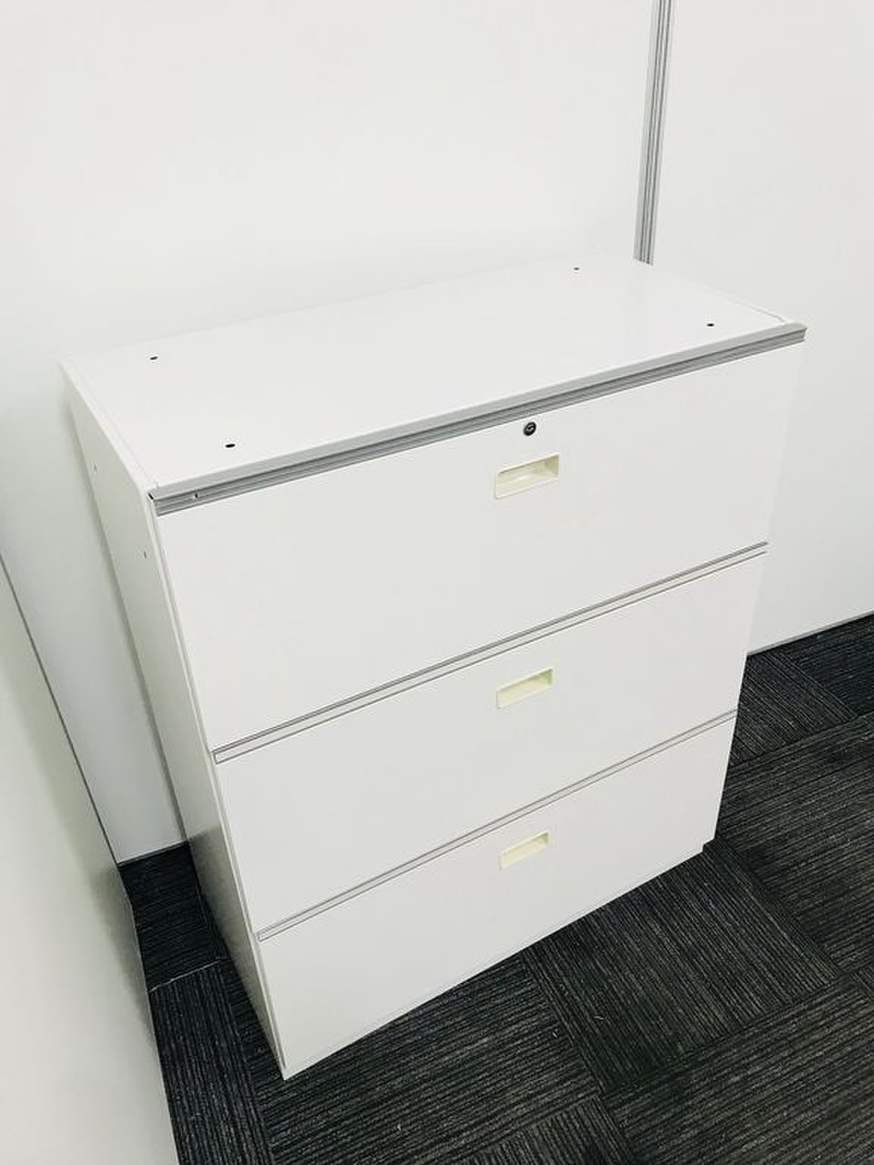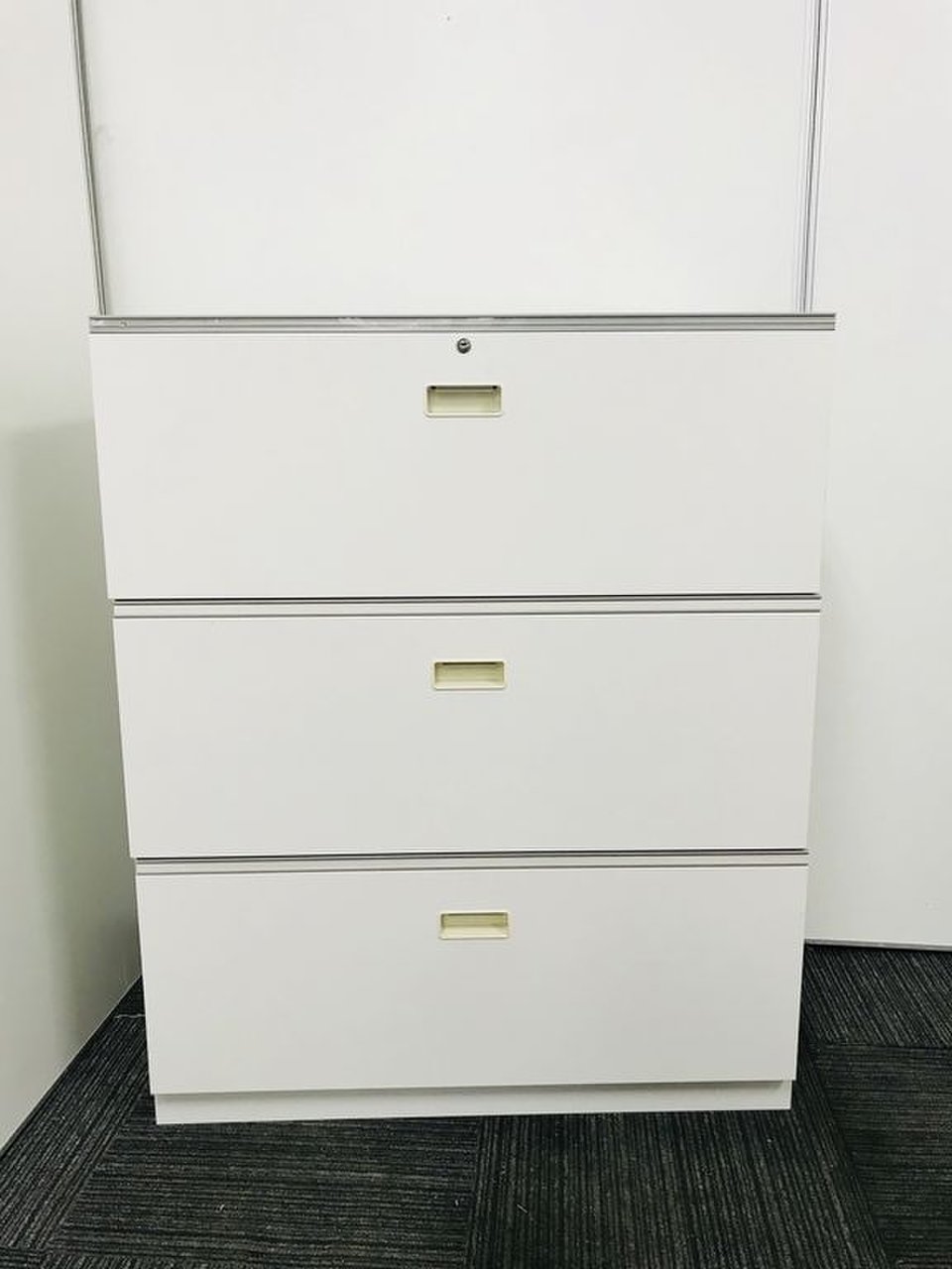 オフィスの収納を陰から支える頑張り屋さん!頑張り屋さんのさがなのか、悲しいことに取っ手が日焼けしておりますが、問題なくご使用いただけます。 ■イトーキ/シンライン/3段収納キャビネット/幅800mm