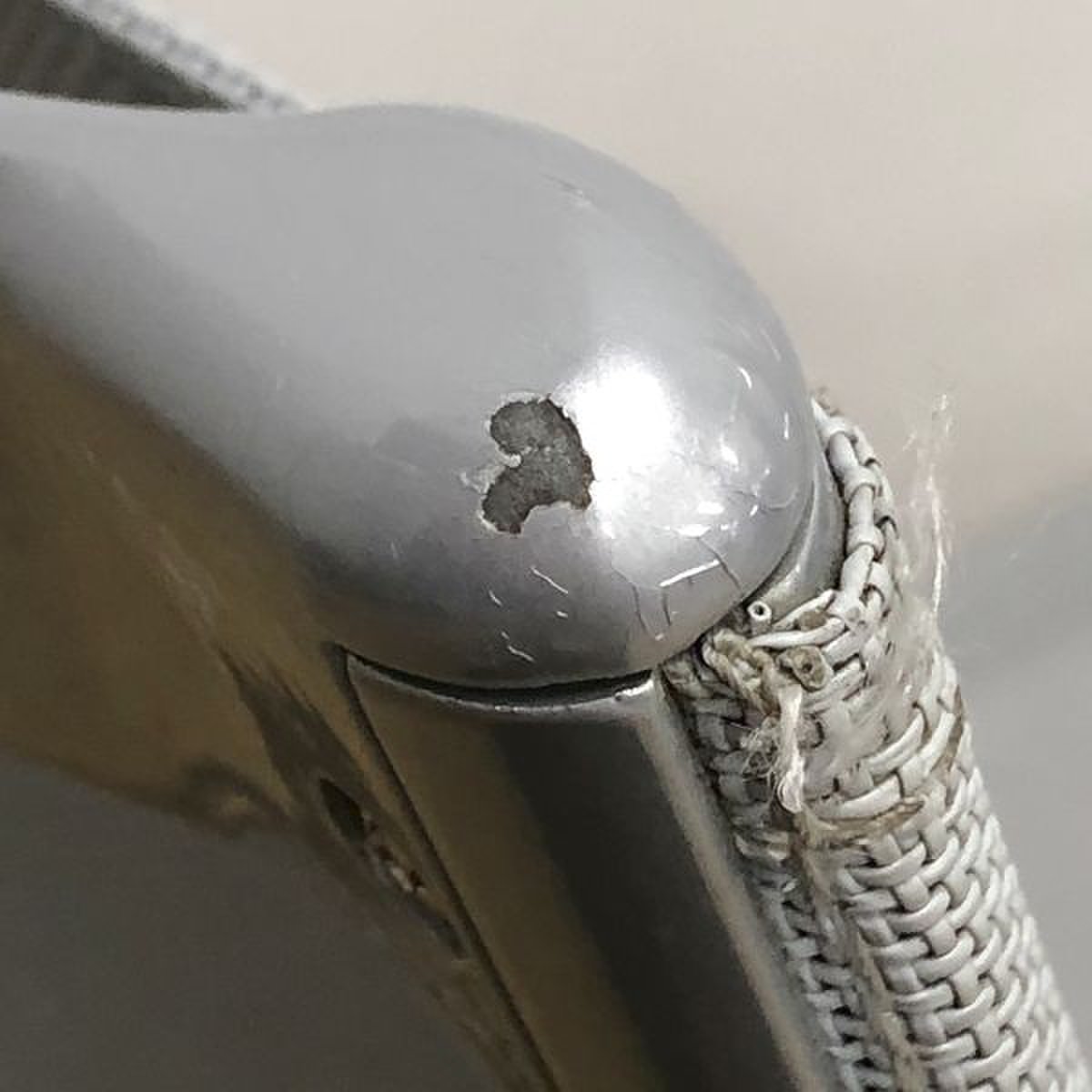 - かなり強い濃い黄ばみ・変色が商品全体にある。(例、座面・背もたれ、脚部等にある。)