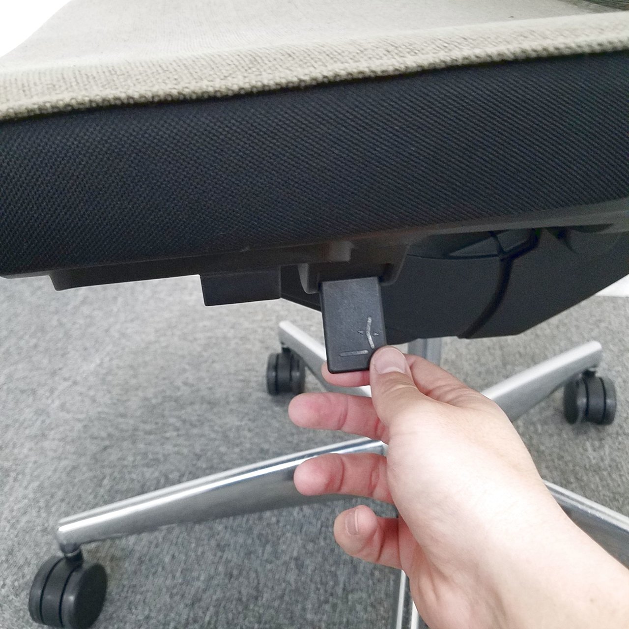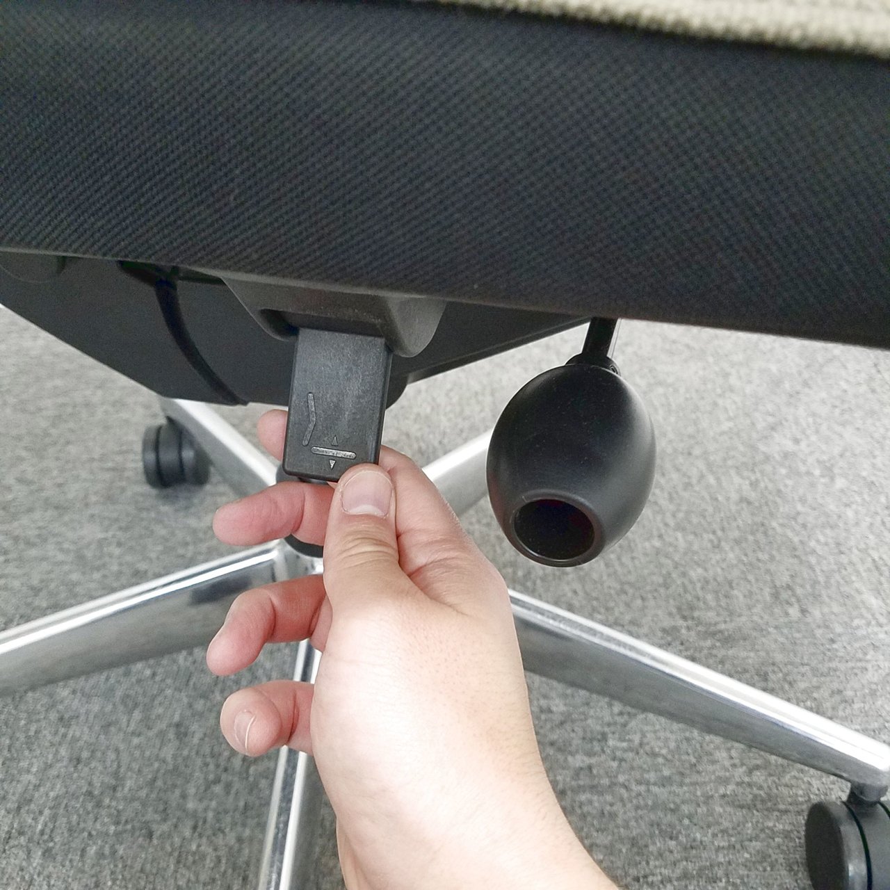 ロッキングは、任意の位置でロックすることが可能で、強さの調節は座面右下のグリップで座った状態で行えます。