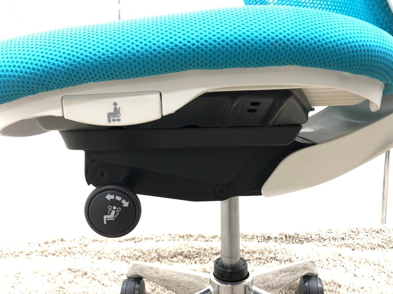- 座面左下のダイヤルでリクライニングの固定と解除が行えます。 前傾ポジションをとることも可能です。