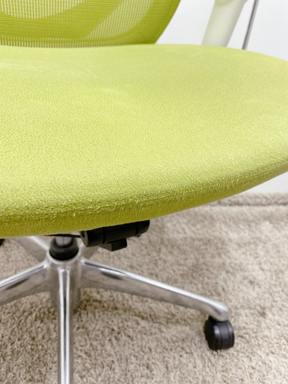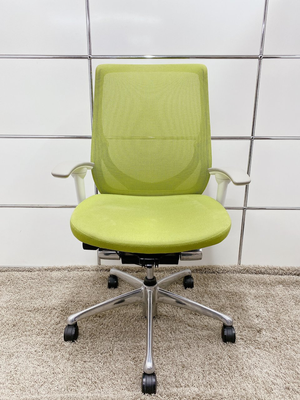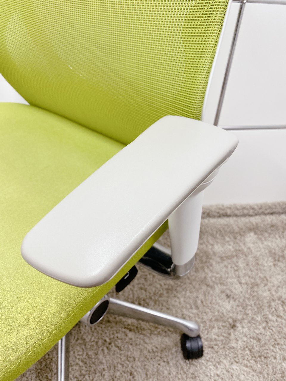 【※見た目を気になければお買い得!】■オカムラ製 ゼファーチェア 可動肘付 ライトグリーン ホワイトフレーム【※肘キズあり商品】