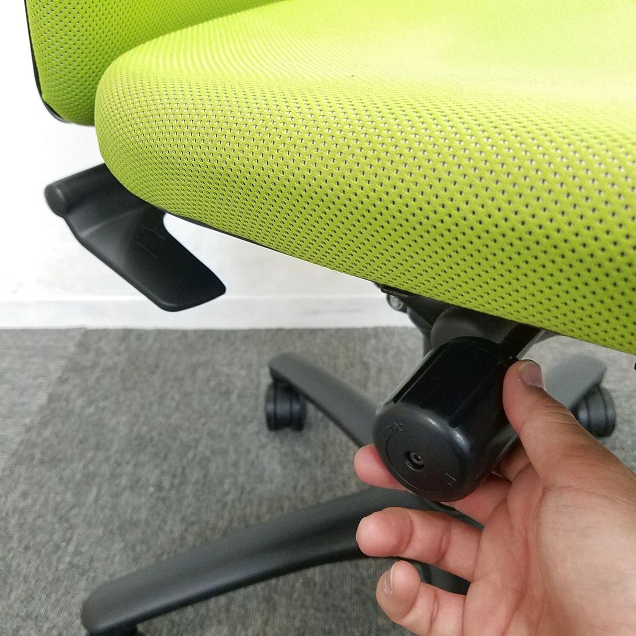 もう一つは、オカムラ社独自の""異硬度クッション""が座面に採用されていることです。これは座面が位置により異なる硬さのウレタンでできており、前方は腿裏を圧迫しないようソフトに、後方はしっかりと体重を支えるために少し硬めに作られています。クッション性とホールド感の両立により、長時間の作業での疲れを軽減してくれます。"