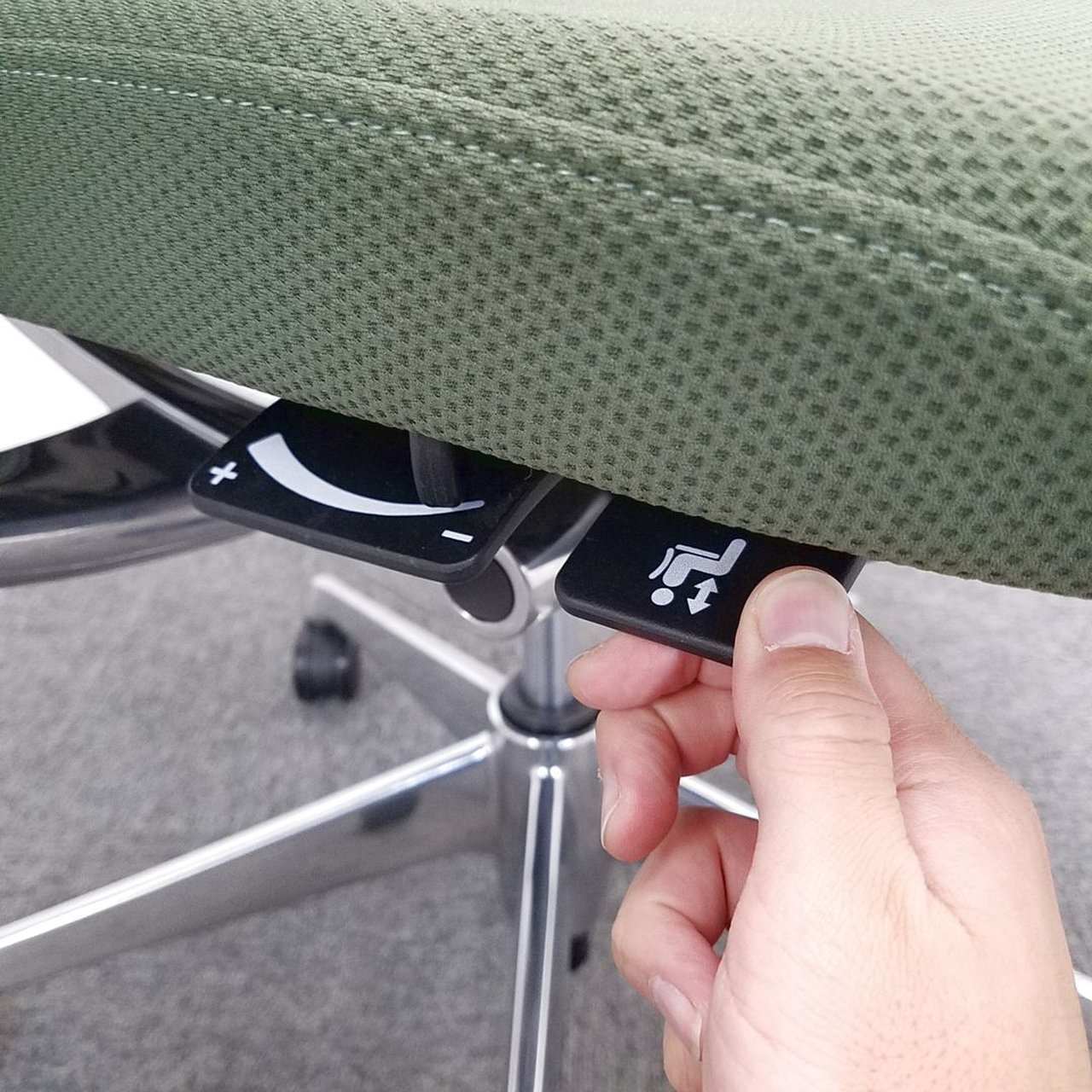 座面の高さや前後などの基本的な調整レバーが座面裏の前方に集約されており、姿勢を変えずに調節ができます。
