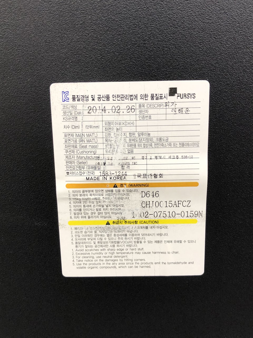 - かなり強い濃い黄ばみ・変色が商品全体にある。(例、座面・背もたれ、脚部等にある。)