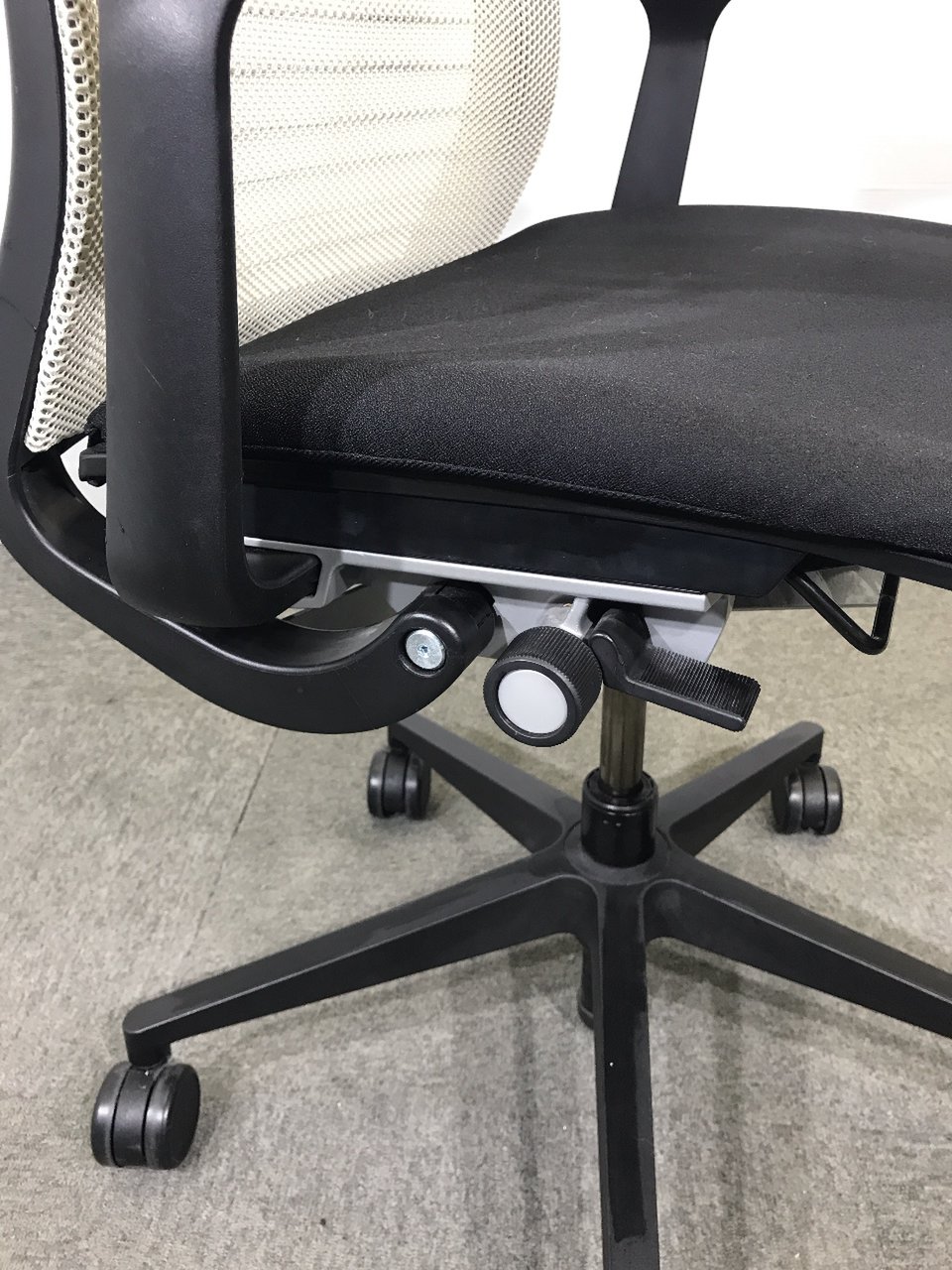 快適な座り心地に不可欠な調節機能である、上下昇降、座面の奥行き調整、リクライニングなどを備えており、操作もわかりやすく好評です。 特に、座面の奥行きは、座面下の左右に通った細いバーで調整でき、座ったままで軽やかに滑るように調整が可能です。 価格面では、新品では高めですが、中古は流通も多く、定価の3割前後の価格で高級チェアの座り心地を手に入れることができます!