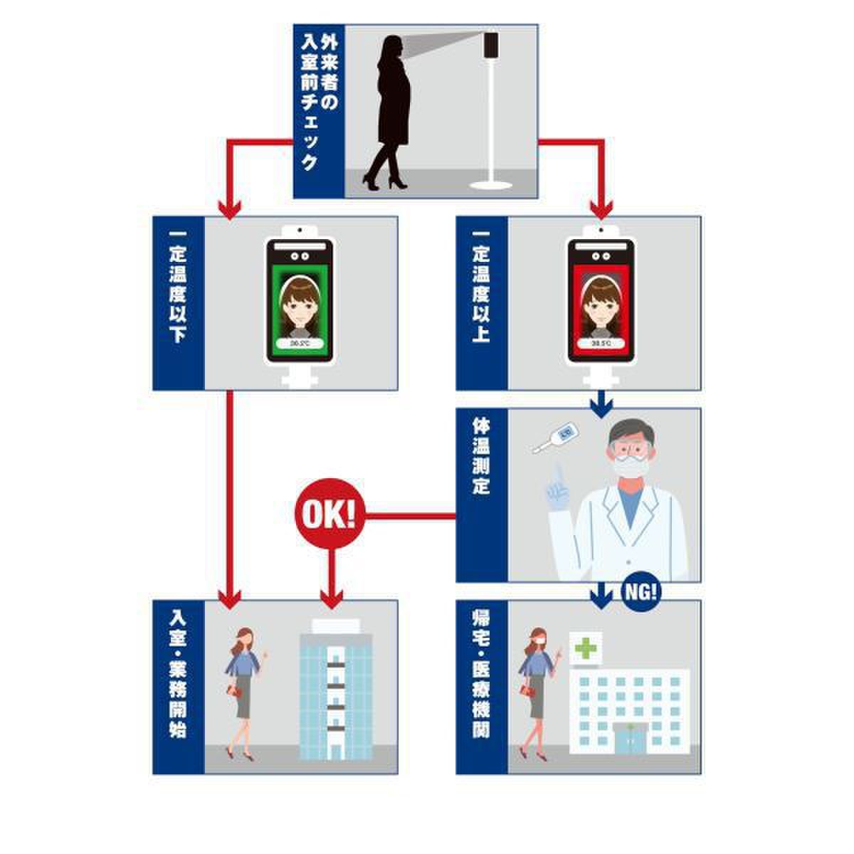 感染の疑いのある従業員や、来訪者を瞬時にスクリーニングし、医療機関での適切な診断を実施するとともに
