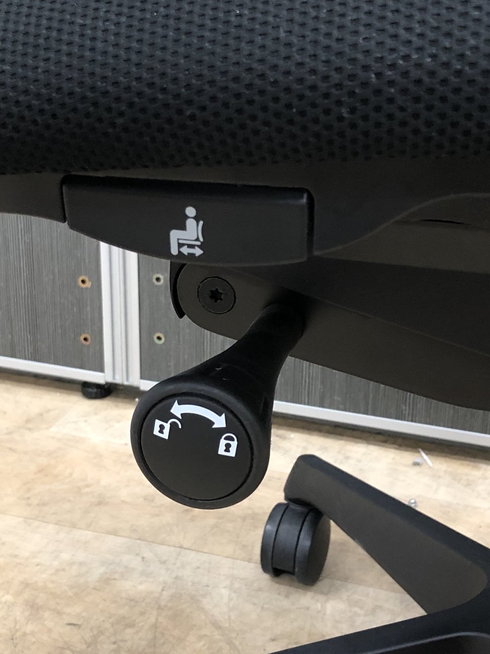 - 座面左下のダイヤルでリクライニングの固定と解除が行えます。 前傾ポジションをとることも可能です。