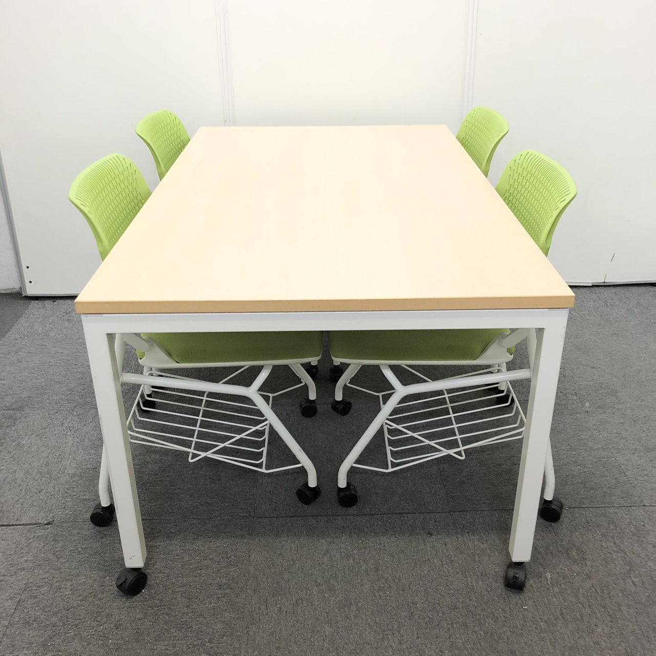 ウチダ製のナチュラルカラーのミーティングテーブル+グリーンカラーのチェアの4脚セット!