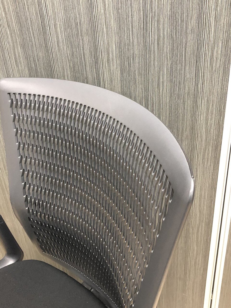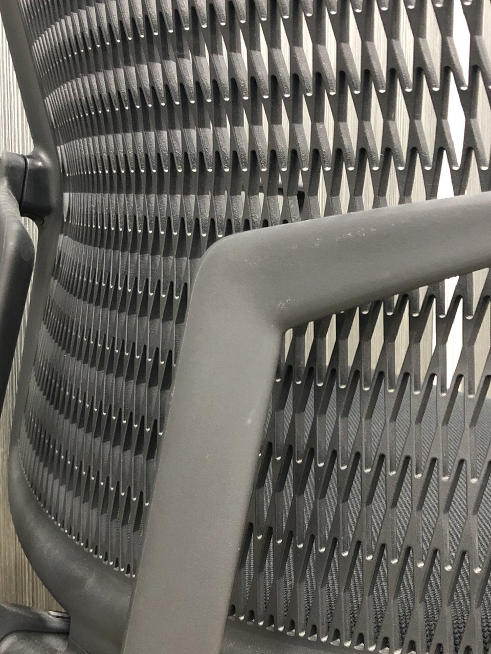 特徴的な背もたれの樹脂メッシュが、もたれたときの体重を受け止めながら