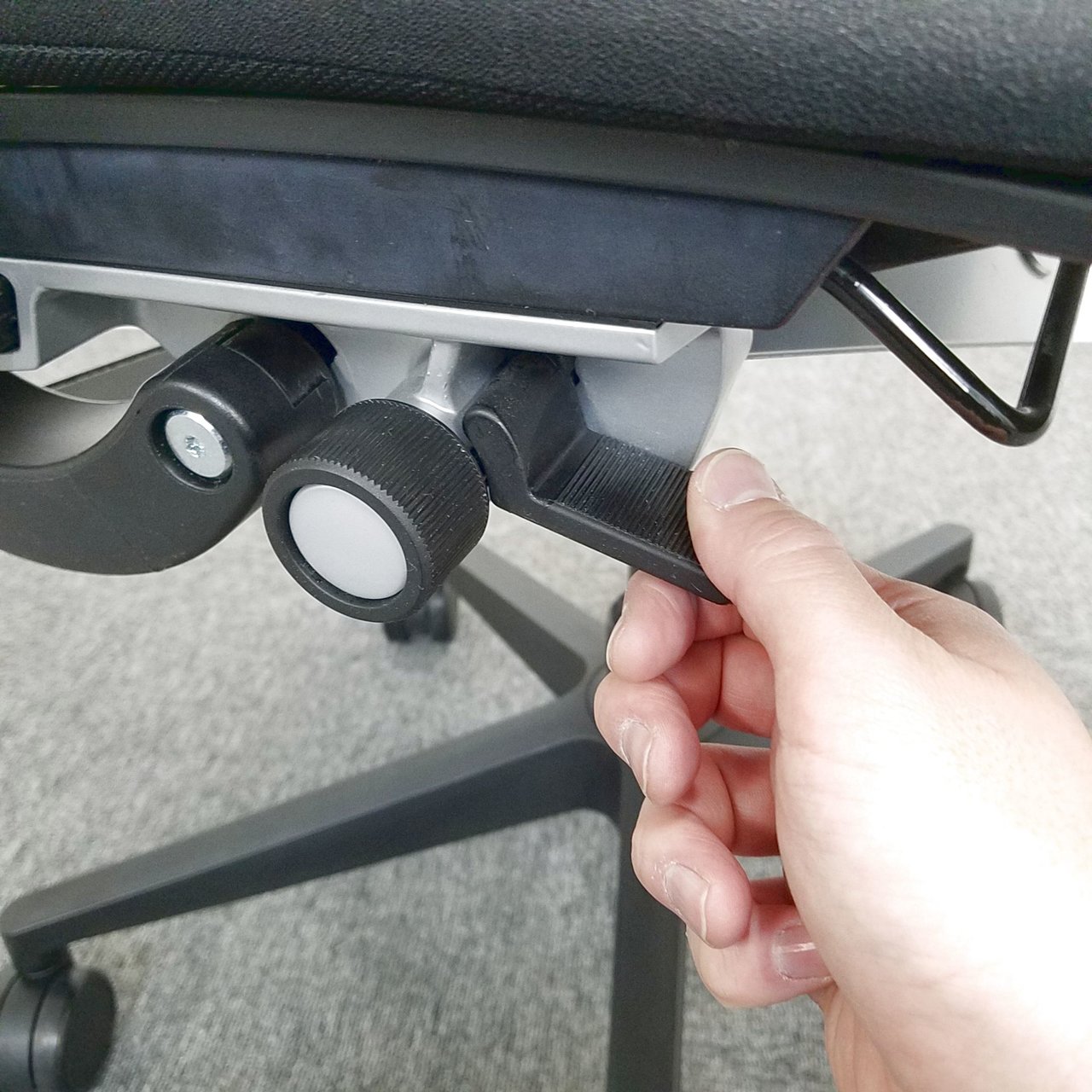 - レバーを引き上げながら座面を前後にスライドさせ、レバーを放すとロックします。背もたれに身体をつけた状態で膝の裏側と座面のエッジの間に5-8センチほどの隙間ができるのが理想的です。