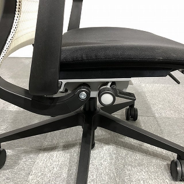 快適な座り心地に不可欠な調節機能である、上下昇降、座面の奥行き調整、リクライニングなどを備えており、操作もわかりやすく好評です。 特に、座面の奥行きは、座面下の左右に通った細いバーで調整でき、座ったままで軽やかに滑るように調整が可能です。 価格面では、新品では高めですが、中古は流通も多く、定価の3割前後の価格で高級チェアの座り心地を手に入れることができます!
