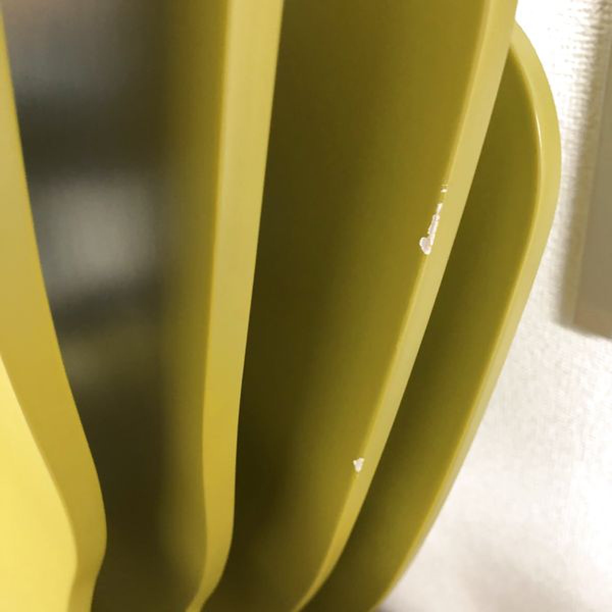 - かなり強い濃い黄ばみ・変色が商品全体にある。(例、座面・背もたれ、脚部等にある。)