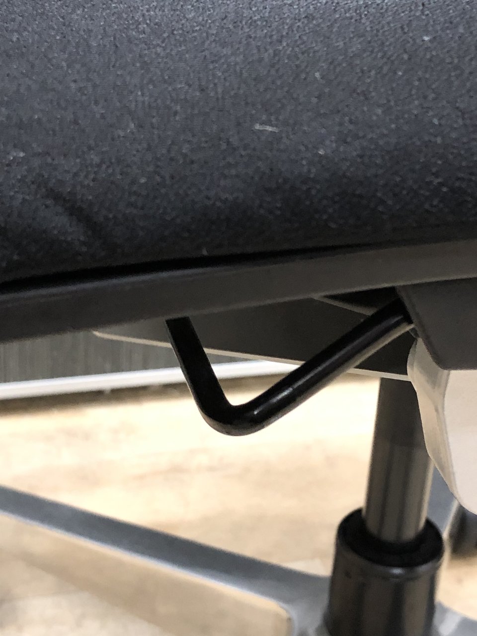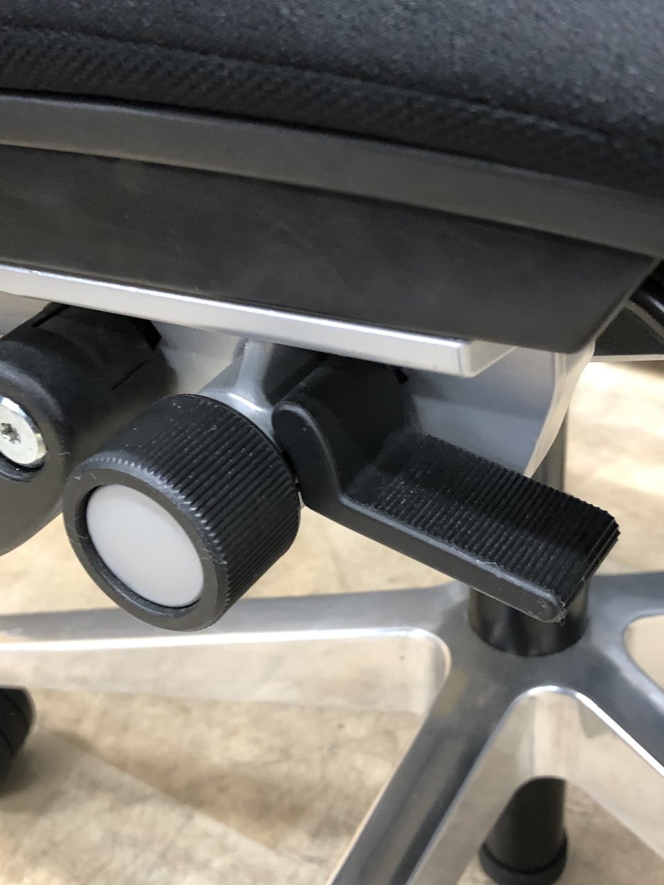 - レバーを引き上げながら座面を前後にスライドさせ、レバーを放すとロックします。背もたれに身体をつけた状態で膝の裏側と座面のエッジの間に5-8センチほどの隙間ができるのが理想的です。