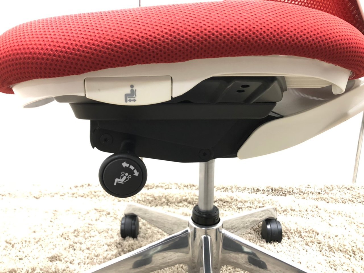 - 座面右下のダイヤル操作で、リクライニングの強弱調整が行えます。これまでのダイヤル式よりも、少ない回転数で、最弱?最強の調整が可能です。