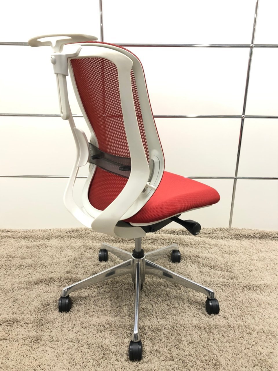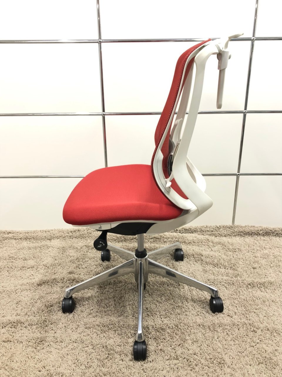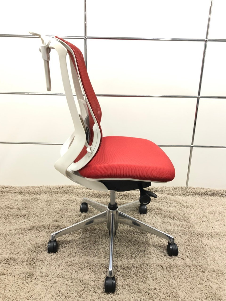 【背もたれのカーブを2段階で変えられる!】■オカムラ製 シルフィーチェア レッド ホワイトボディ アルミポリッシュ脚 ハンガー付き