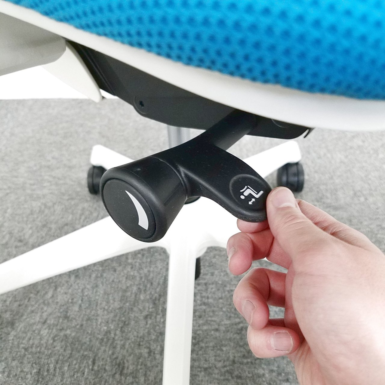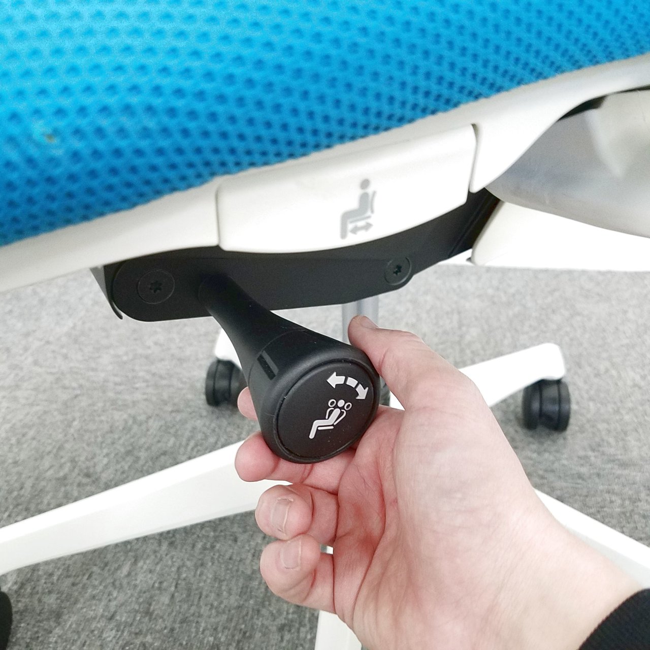 - 座面右下のダイヤル操作で、リクライニングの強弱調整が行えます。これまでのダイヤル式よりも、少ない回転数で、最弱?最強の調整が可能です。