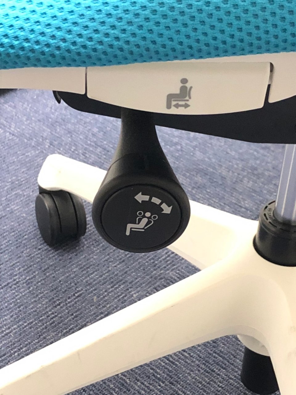 - 座面右下のダイヤル操作で、リクライニングの強弱調整が行えます。これまでのダイヤル式よりも、少ない回転数で、最弱?最強の調整が可能です。