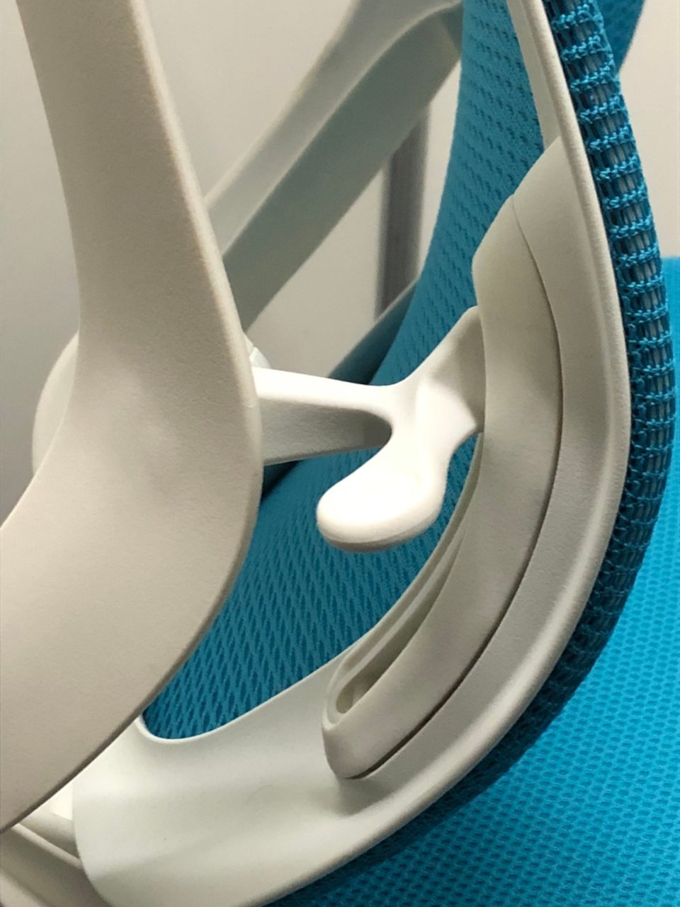 - お尻を包み込むような曲面が、快適な座り心地をサポートします。また、硬さの異なる3種類のウレタンを一体で成型。