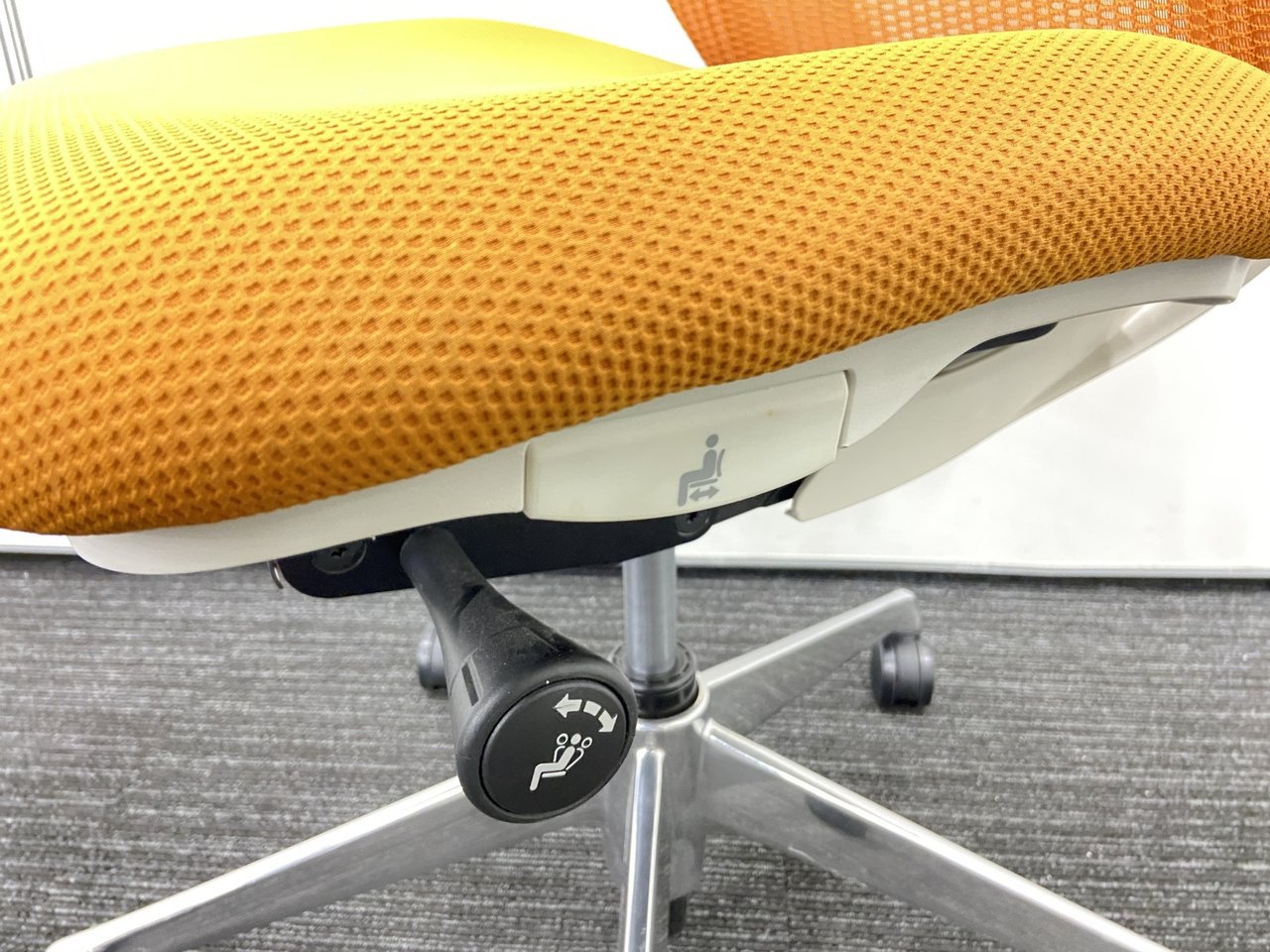 - 座面の左にあるレバー操作により、座面の奥行き調整が可能です。(ストローク:50mm)