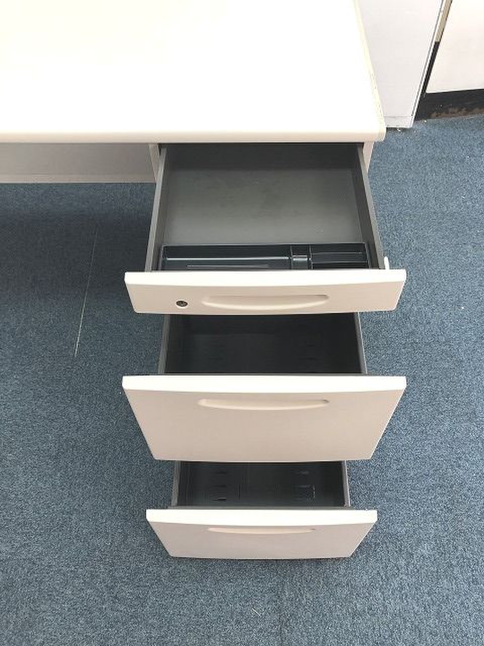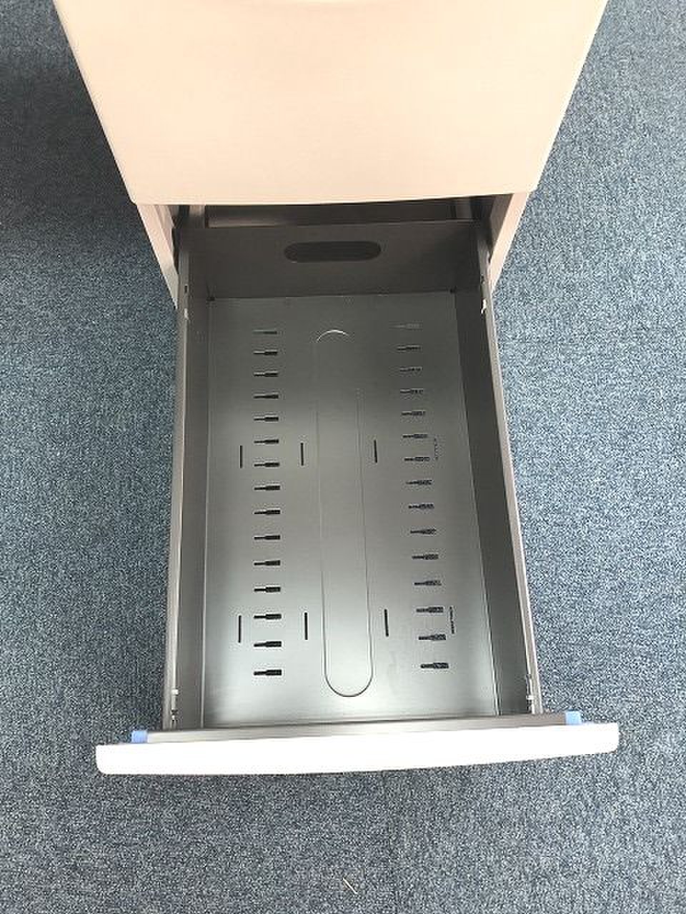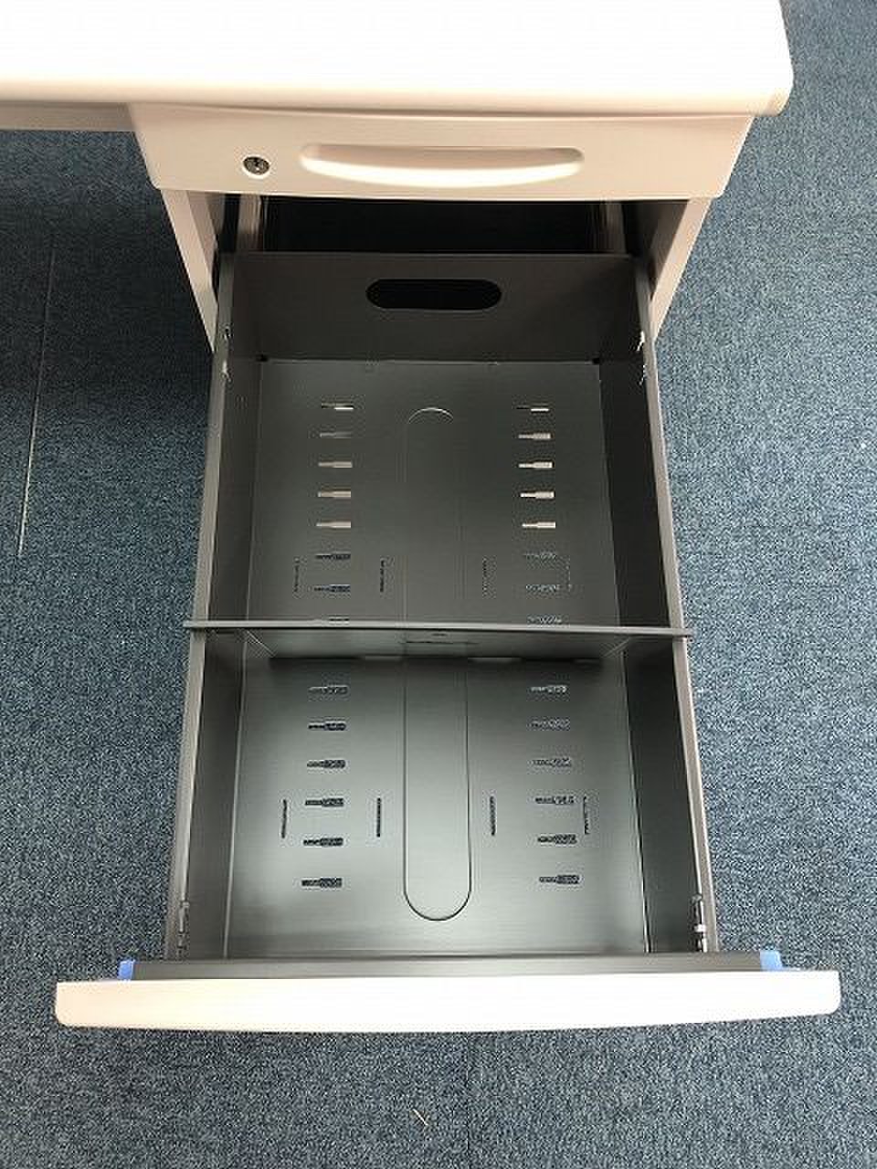 - 袖机のワゴンは、最下段がロング引出しになっており、従来より収納力120%アップ。