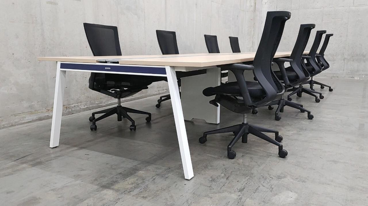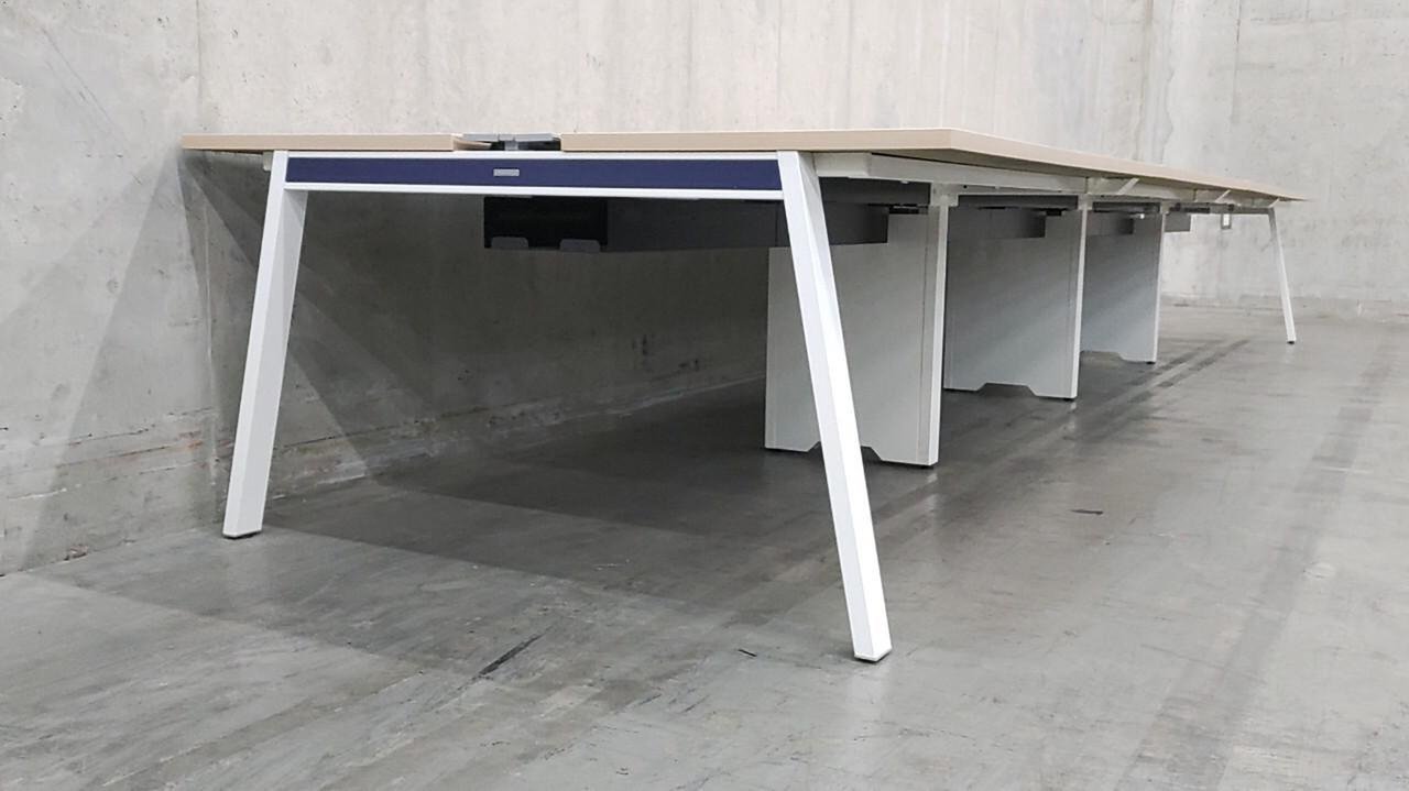 幅5600mm【オフィスのフリーアドレス化にも!】 明るい木目天板にホワイトの脚が映える! オカムラ/マニフォールド 【倉庫在庫品】ブルーエンブレム- 品川・三田店