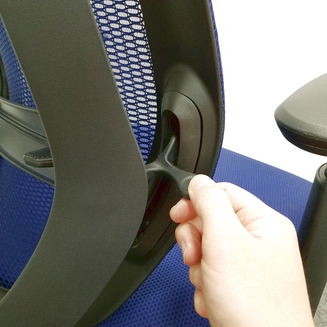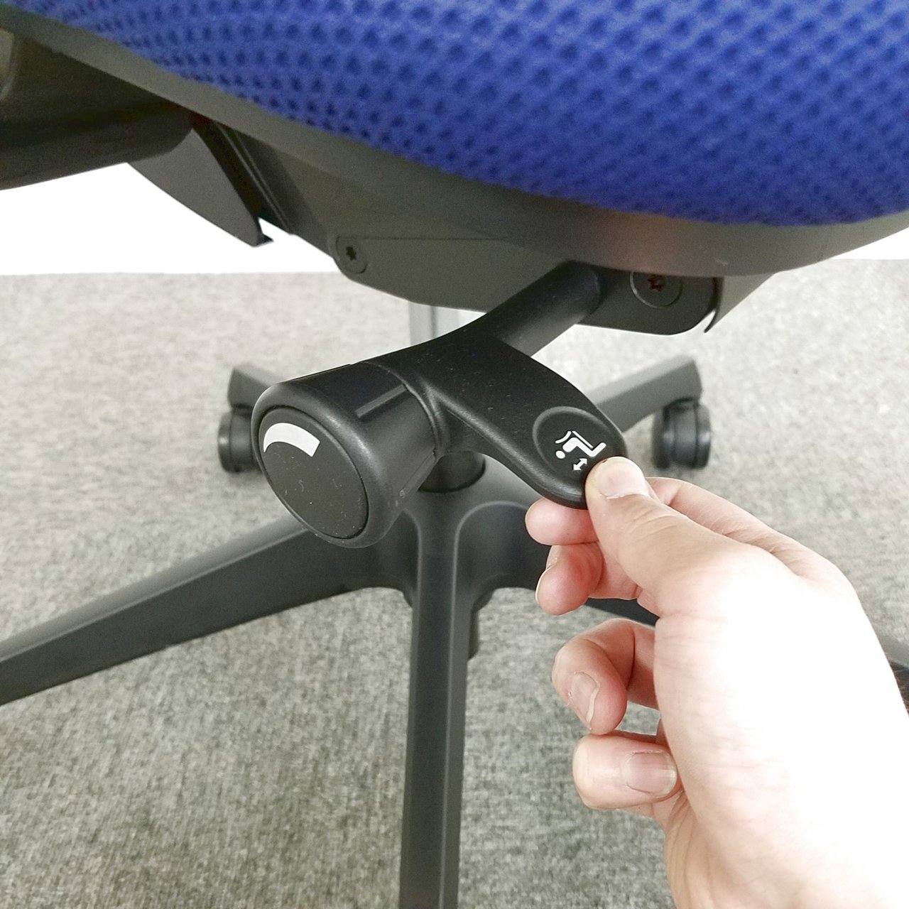 - 座面右下のダイヤル操作で、リクライニングの強弱調整が行えます。これまでのダイヤル式よりも、少ない回転数で、最弱?最強の調整が可能です。