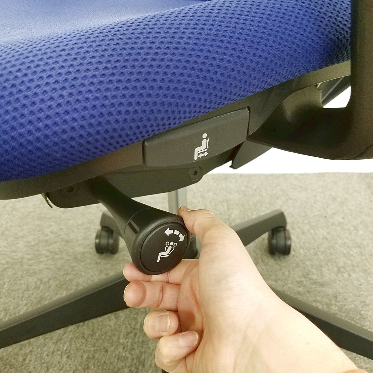- 座面の左にあるレバー操作により、座面の奥行き調整が可能です。(ストローク:50mm)