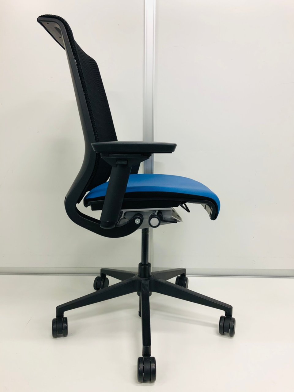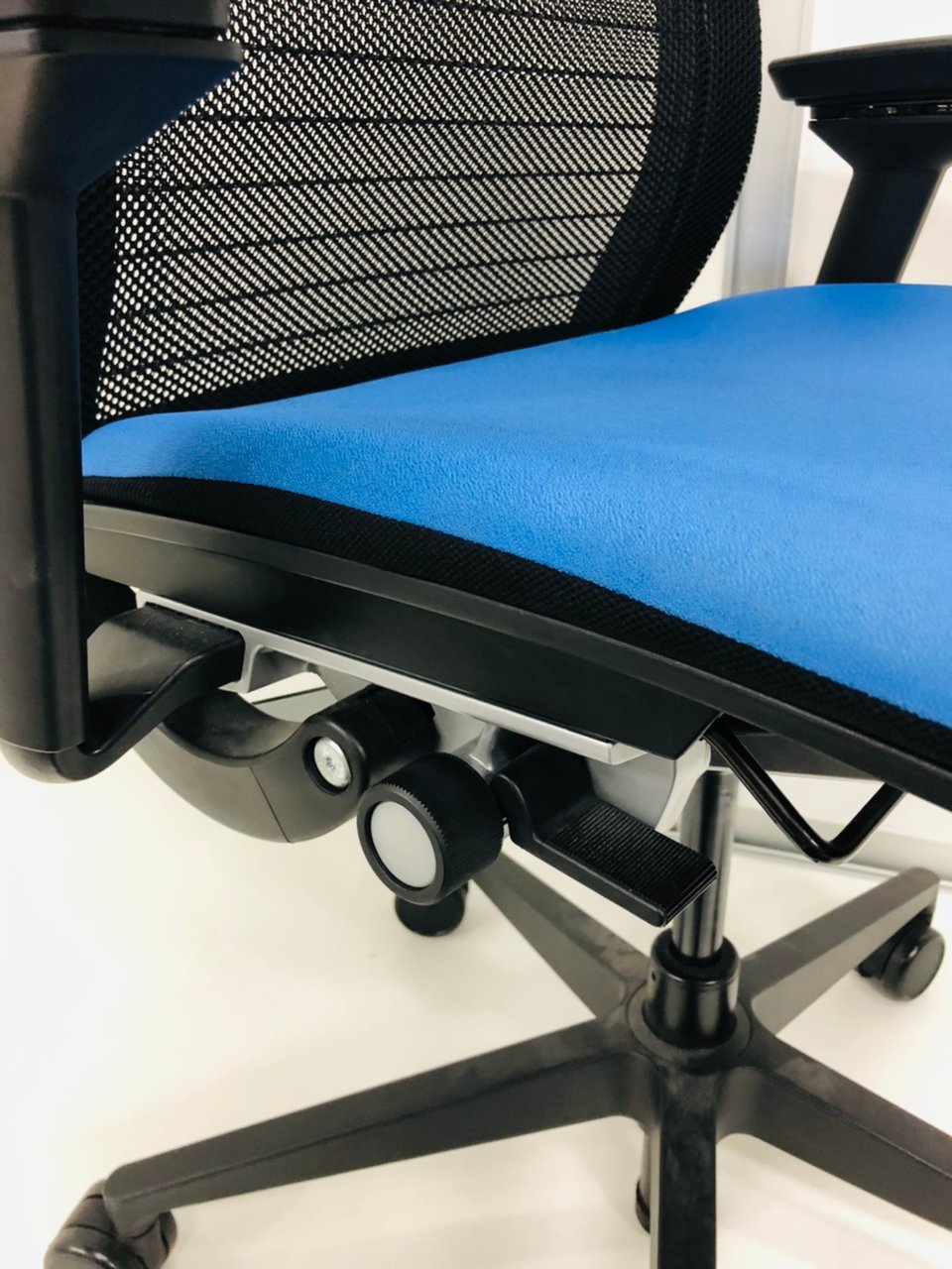 快適な座り心地に不可欠な調節機能である、上下昇降、座面の奥行き調整、リクライニングなどを備えており、操作もわかりやすく好評です。 特に、座面の奥行きは、座面下の左右に通った細いバーで調整でき、座ったままで軽やかに滑るように調整が可能です。 価格面では、新品では高めですが、中古は流通も多く、定価の3割前後の価格で高級チェアの座り心地を手に入れることができます!